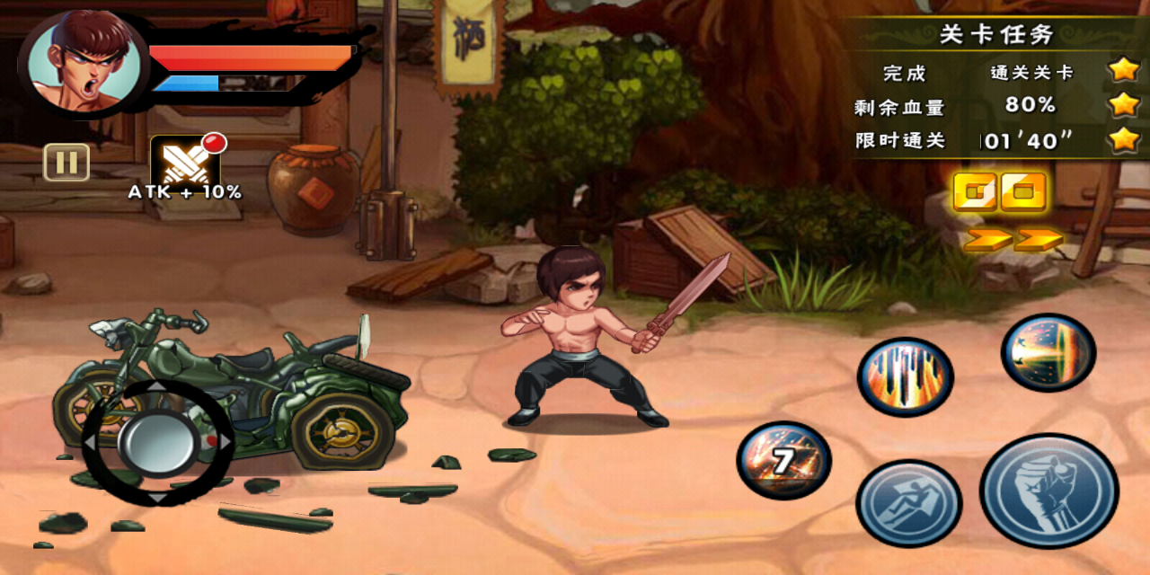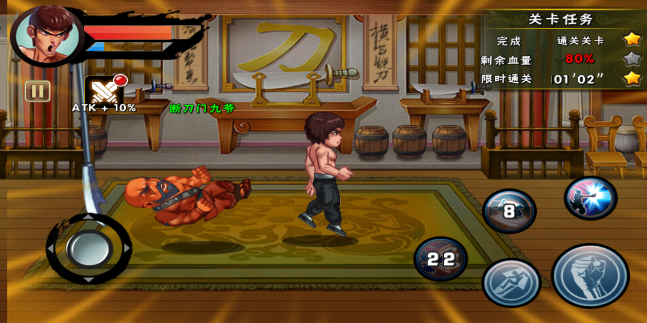 从《功夫激战》的操作方式看,熟悉王者荣耀的玩家必定能够轻松上手,因为键位上基本一致,屏幕左方为移动人物,右侧则有攻击和技能按键。不得不说《功夫激战》作为格斗游戏,打斗手感上确实下足功夫,颇有经典名作快打旋风的手感,战斗拳拳到肉,音效恰到好处,华丽的技能效果也增加了战斗的乐趣。