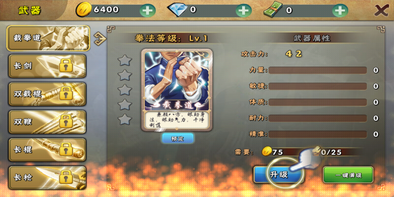 除了武术流派的自定义上,玩家还能通过升级角色来提升战斗能力,分别有普通培养和强力培养可供选择,金币和钻石都能让角色能力有所提升,所以资源的分配亦十分重要。随着游戏进程的深入,敌人强度也会提升,每个关卡前都有推荐战斗力的提示,如果玩家没有及时提升自己,可是会在BOSS战吃尽苦头哦!