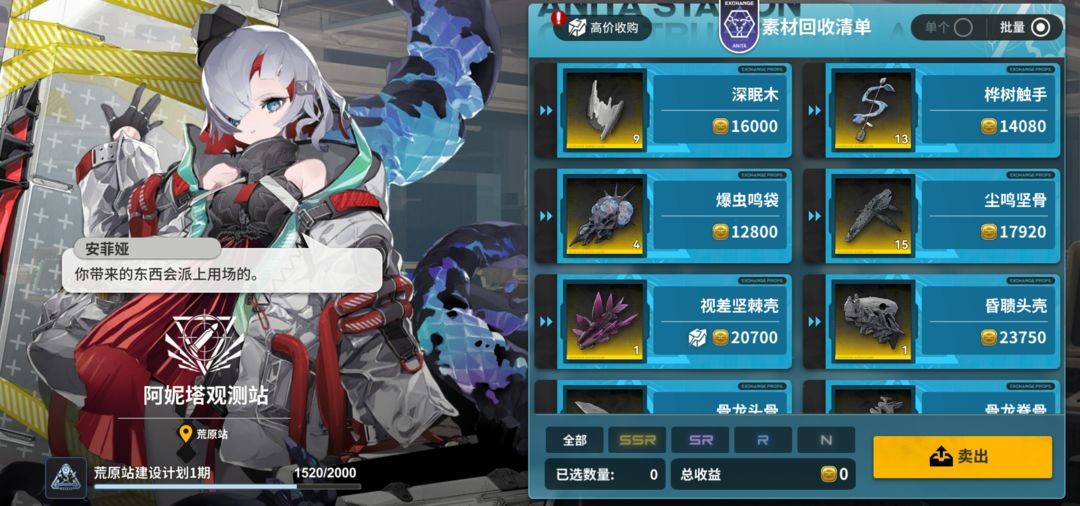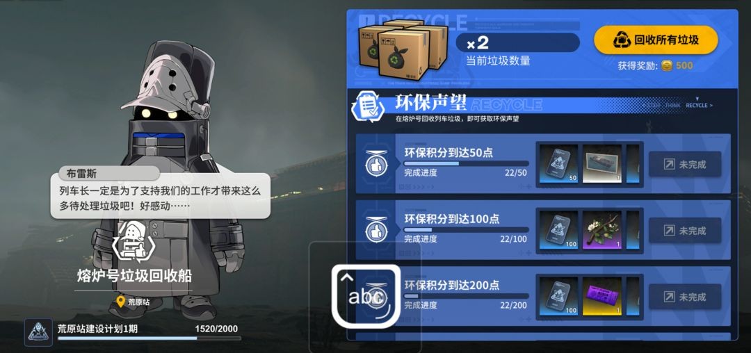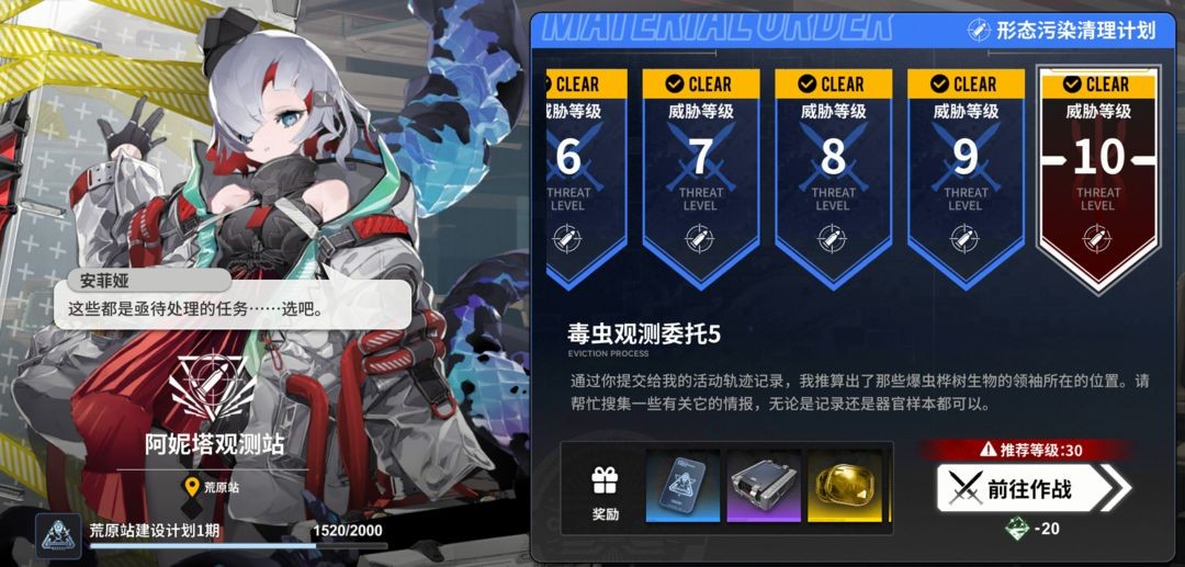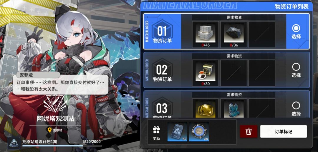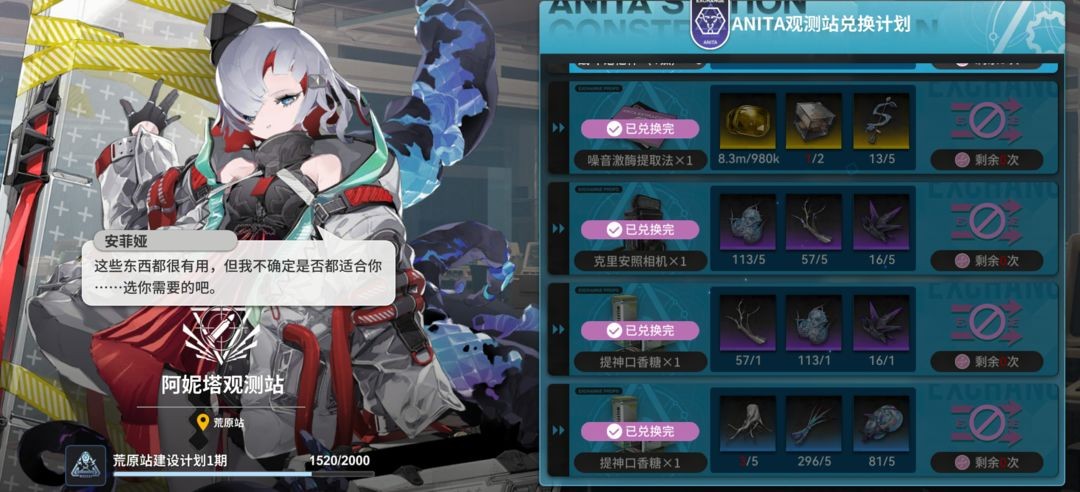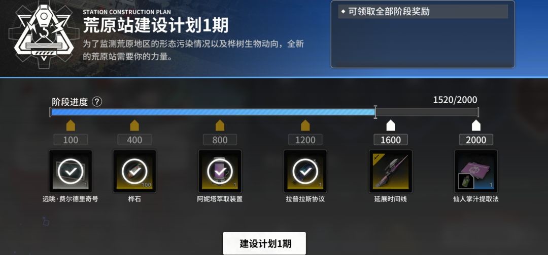-累积建设进度可获得相应的奖励,至少累积800进度兑换生产设备【阿妮塔萃取装置】,2000进度的【仙人掌汁配方】不用急着入手,抽时间刷刷【作战计划】和【物资运输(仅送钱)】即可刷满。