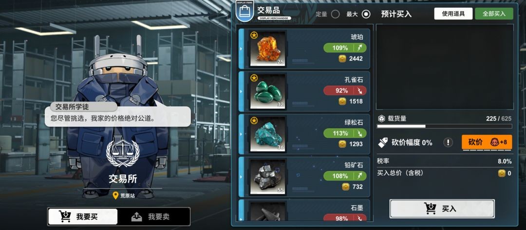 -功能评价:由于一开始【荒原站】发展度较低,前期不会出现跑商利润可观的商品。可就算发展度高了之后,会有【孔雀石】/【琥珀】这些新商品上架,跑商利润也还是无法超越【修格里城】和【铁盟哨站】。可能以后出新的物品生产线时会用得上这些地方特产,当前版本暂时就未来可期吧。