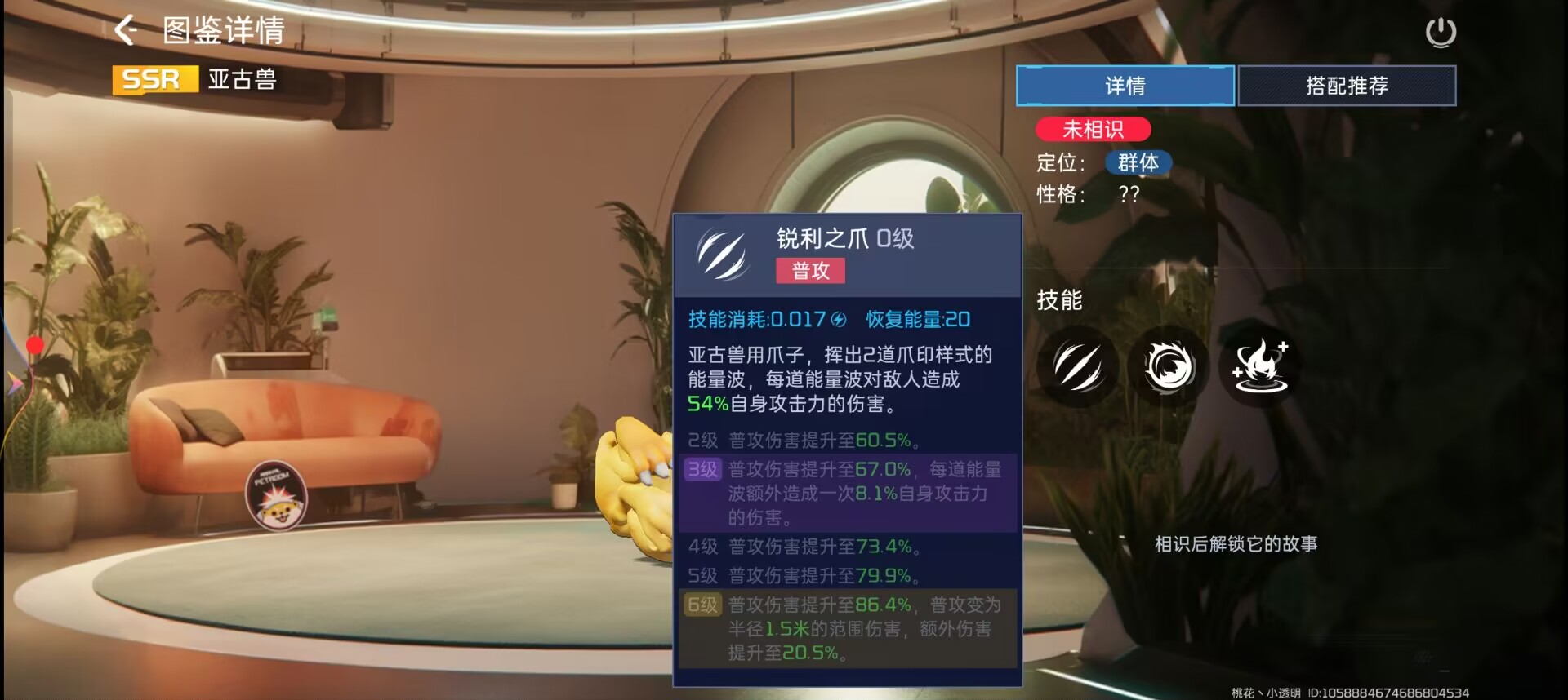 普攻为:锐利之爪。挥出两道能量波,造成54%的攻击伤害,满级6级以后,普攻范围提升为1.5米的,伤害提高为86.4%。