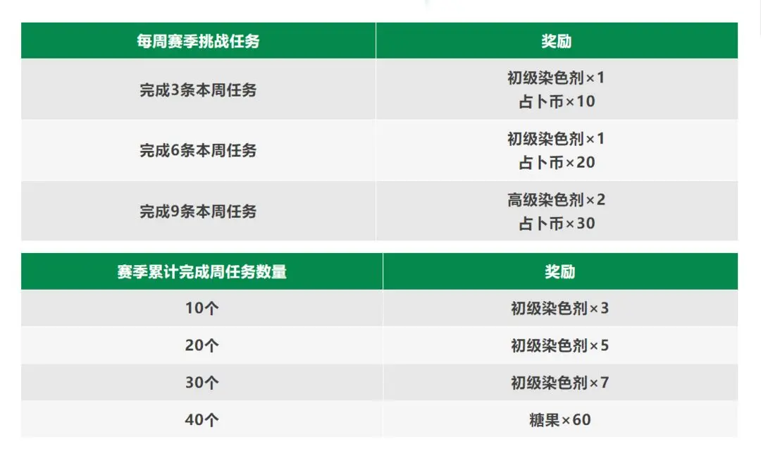 即可相应获得染色道具和占卜币!在整个赛季累计完成一定数量的周任务后,还将获得染色道具和糖果奖励!