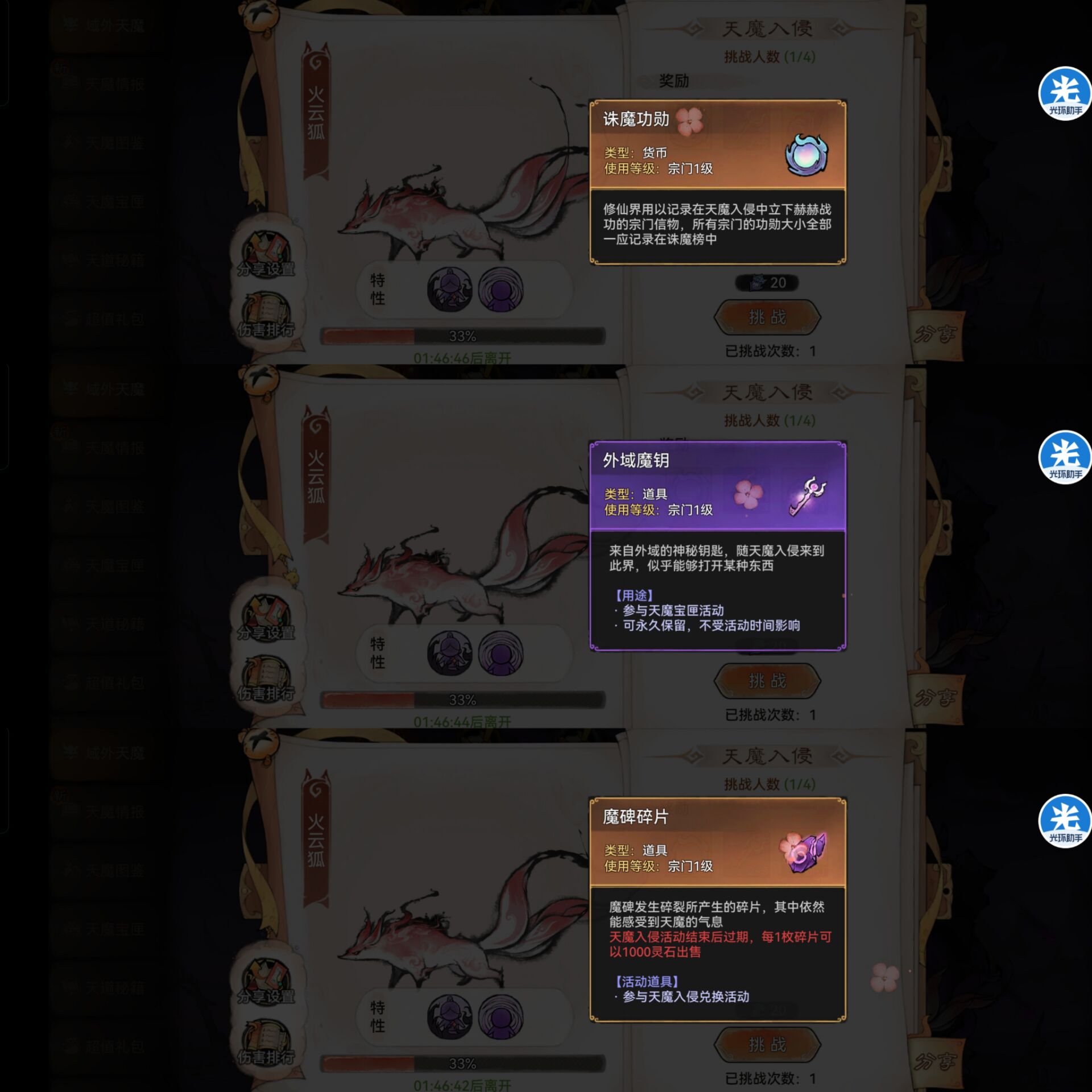 成功击退天魔可以获得三种奖励:诛魔功勋、外域魔钥、魔碑碎片,这三种奖励。