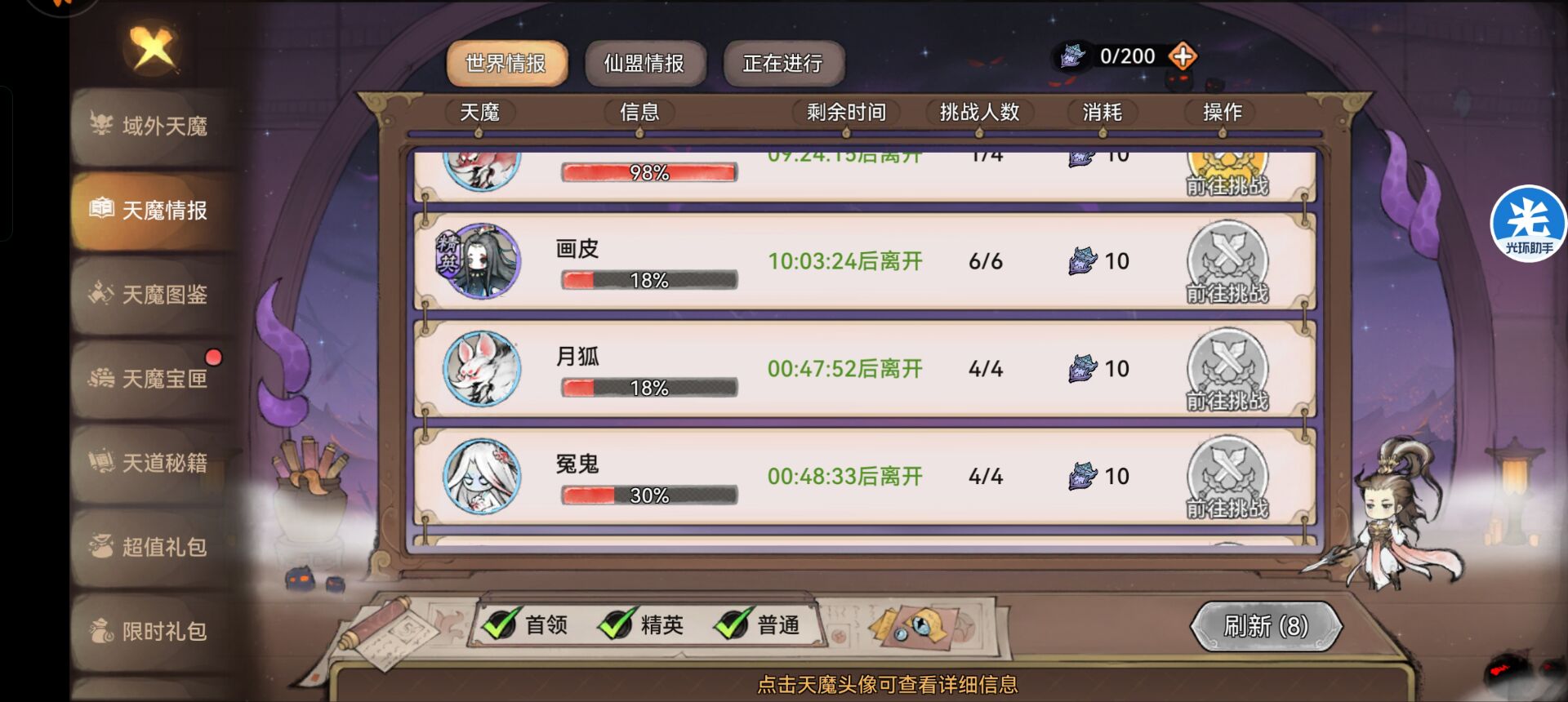 活动开启以后,会有三个天魔入侵,祖师可以挑战这三个天魔。