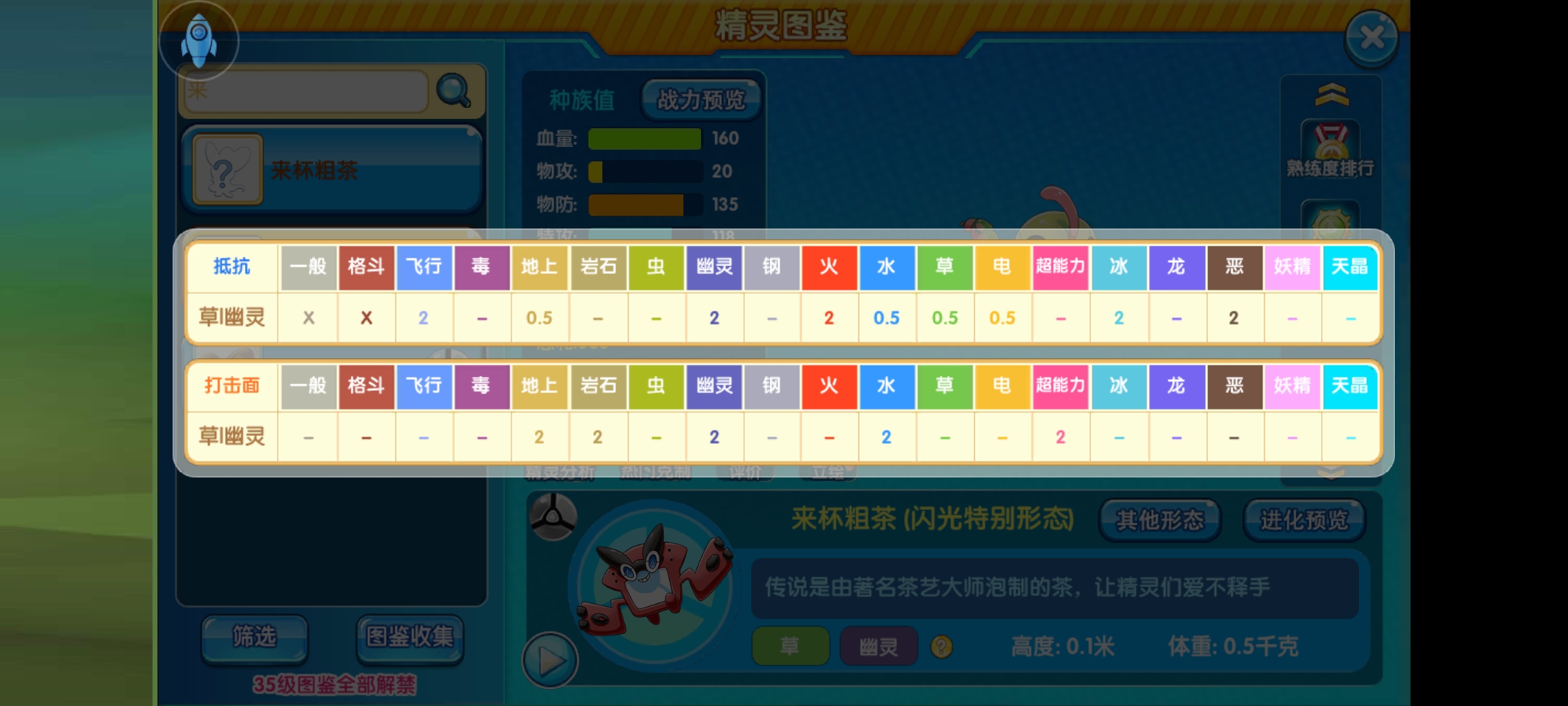 幽灵系+草系的属性组合的弱点不多,抵抗地上系、水系、草系、电系。弱飞系、幽系、火系、冰系与恶系,免疫一般与格斗系,其他都是一倍,抵抗上不算差,可以联防不少宠出场,弱点上火系与冰系以较热门,飞系上注意图腾马。鉴于它特盾杰出,主要抵抗的就是水龙这些。