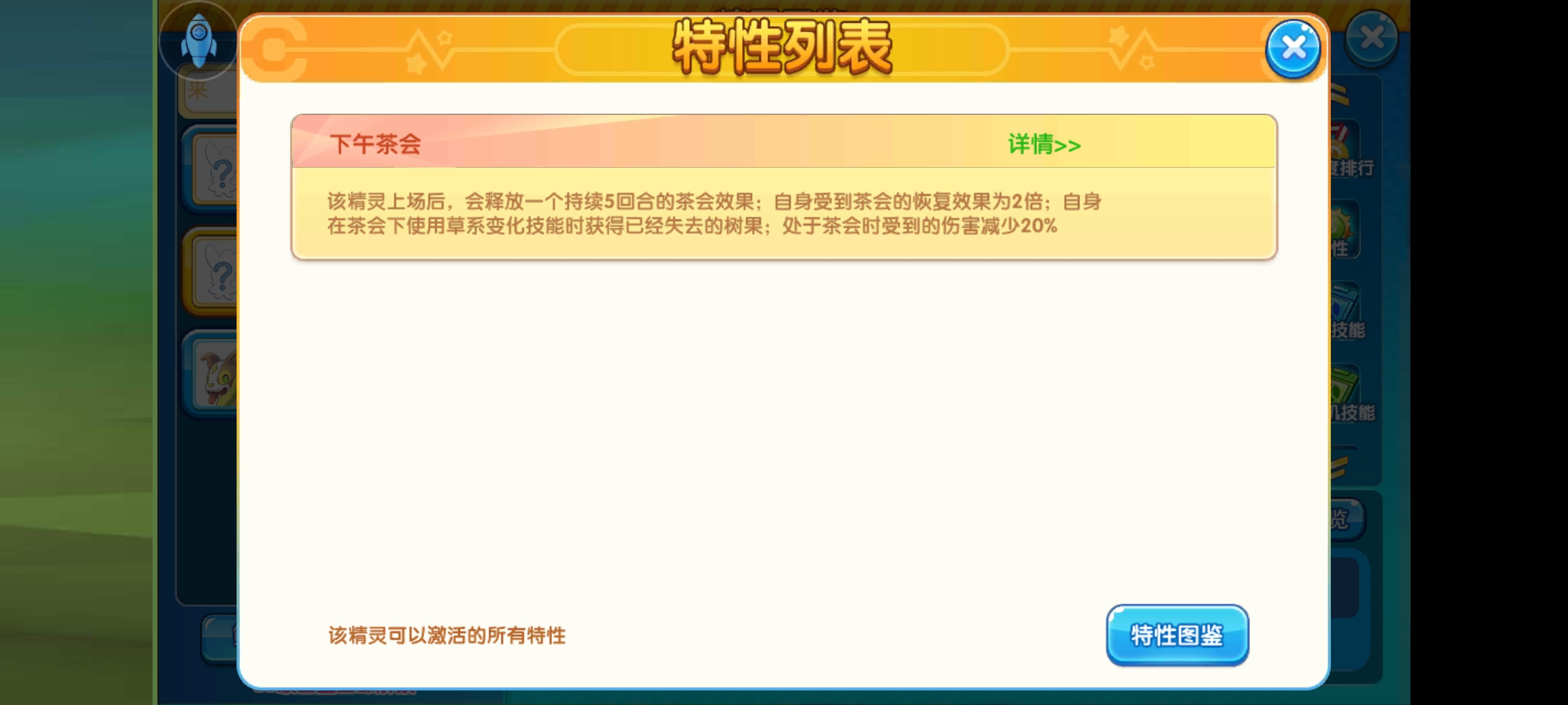 特性就一个。是个辅助向特性,也是独有的特性下午茶会。主要功能是该精灵上场后,会释放一个持续5回合的茶会效果;自身受到茶会的恢复效果为2倍;自身在茶会下使用草系变化技能时获得已经失去的树果;处于茶会时受到的伤害减少20%。茶会效果:持续期间场上的精灵在回合结束时会消耗自己身上树果栏的道具,消耗后回复10%血量,特性方回复量为2倍,回复20%血量。如果被对方使用了啄食或者虫咬给消耗掉了树果,那么不会获得已经失去的树果。处于落拳状态的精灵处于茶会时不会消耗树果。处于魔术空间、征收、魔法封印、泥浆封印的精灵,不会被茶会效果影响,场上存在特性是紧张感的精灵时,对方不被茶会,消耗树果时不会触发树果的效果。