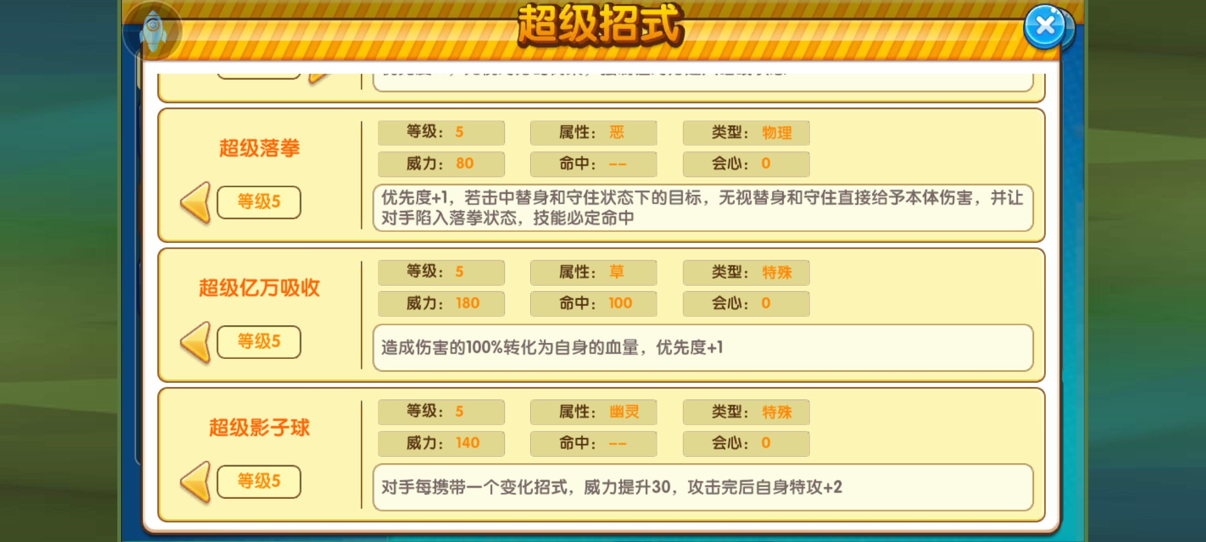 它的大招有六个,这里面除了常规的水本和幽灵本,其他都各自有特点。不过对于它来说还是推荐超级落拳和超级亿万吸收,这两个其实都不错。我先给大家分析下作用。