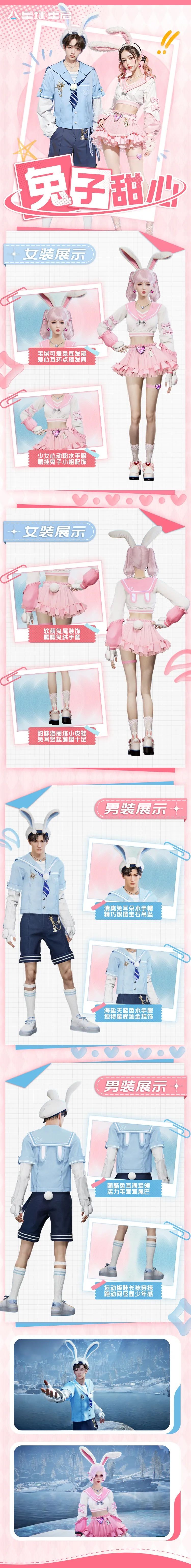 「兔子甜心」时装包含发饰、上衣、下衣、手部和鞋子共五个部位,男女款均为水手服改版,女款粉色蛋糕裙甜美可爱,男款天蓝色海军服则增添了少年感。