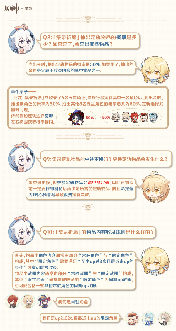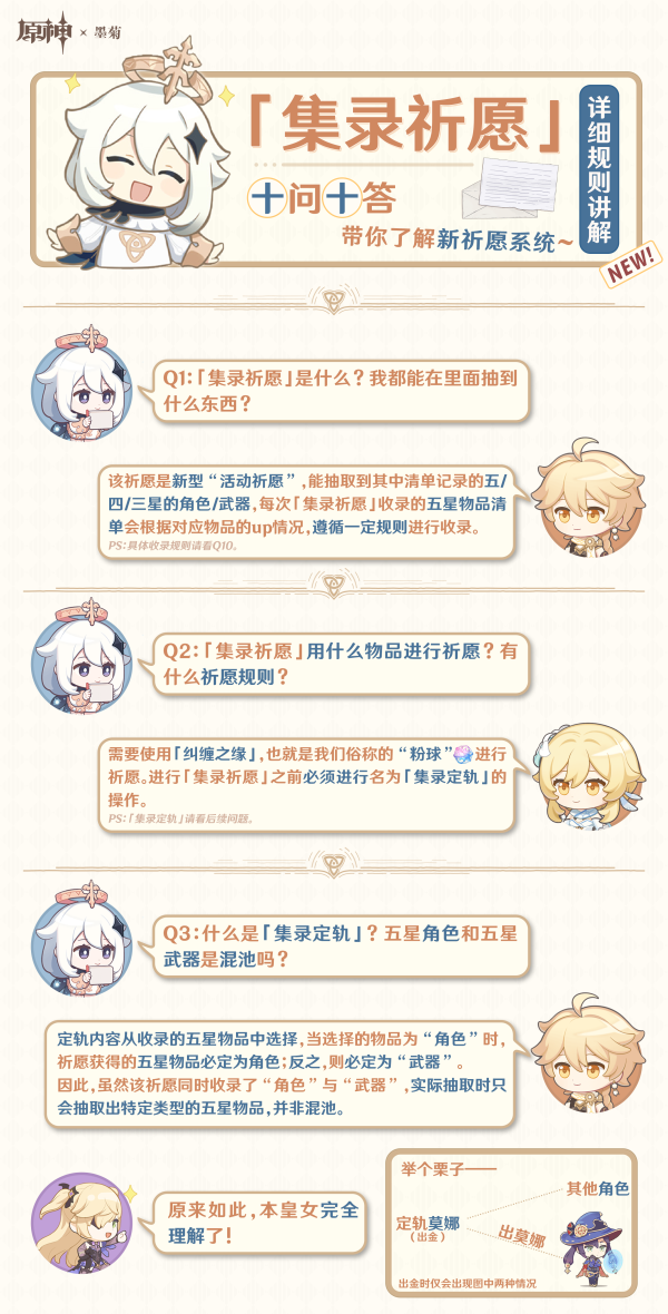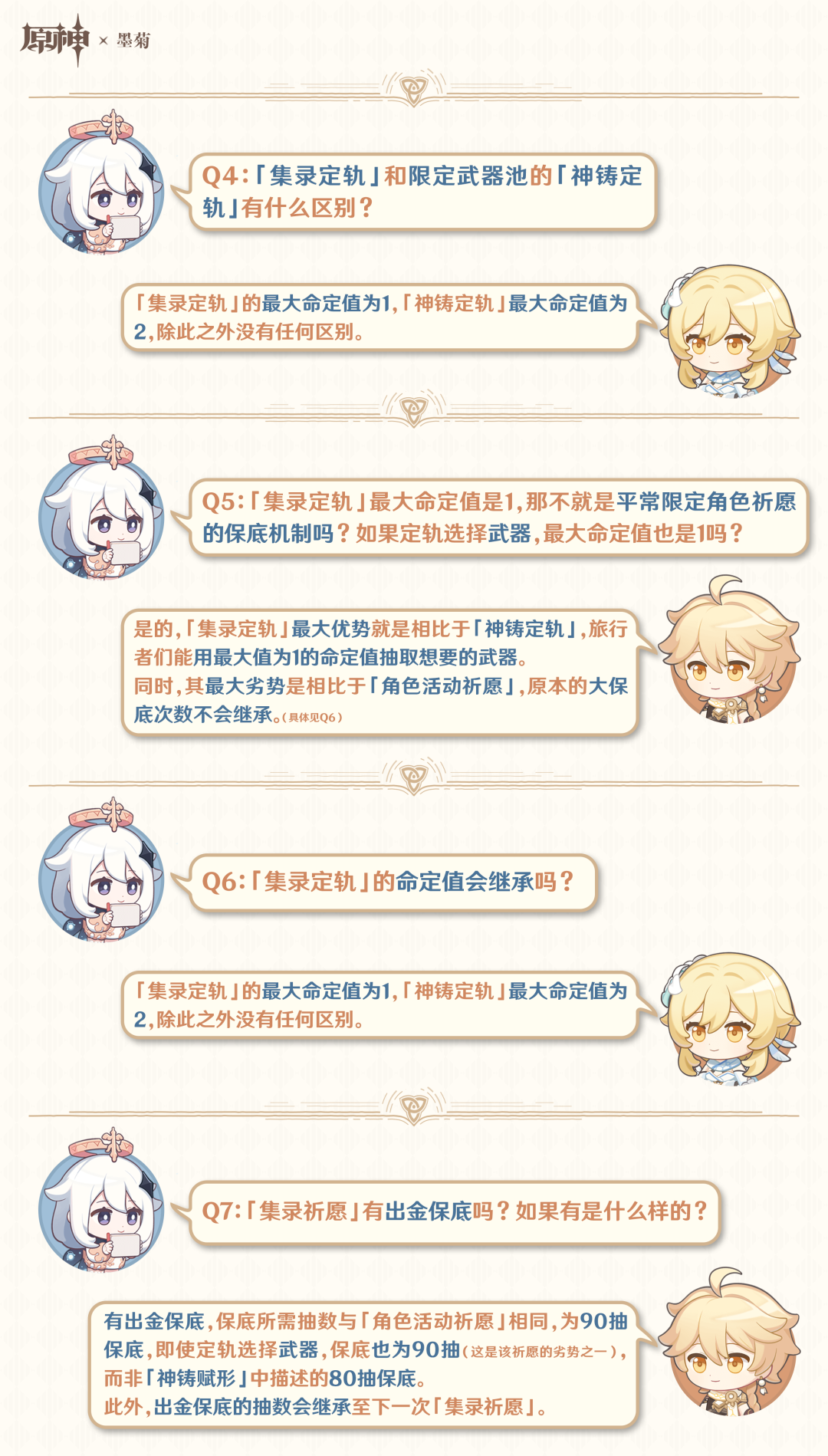 十问十答带你了解「集录祈愿」机制|「晨风之诗」卡池简析,厨子的专属?还是另有价值原神 - 新闻星发布于 2024-03-11关注 哈喽,各位旅行者们大家好呀,V4.5版本在即,此次即将登场新的祈愿系统「集录祈愿」,今天给大家讲讲这个新祈愿系统的运行方式与五星物品相关抽取建议。*文中的“出金”即为“抽出五星物品”。 下来将逐一介绍每一个up角色/武器的抽取价值这次角色所属地区均为蒙德,且大部分来自西风骑士团—— 「优菈」——冰元素物理输出双手剑角色,初登场时刷新了核爆大数字上限,满命后核爆数字大小更为可观,作为物理输出角色,低命优菈在实战中存在能量循环与出伤速度问题,在伤害乘区与元素反应上也较为劣势。随着深渊对输出与循环的要求提高后,优菈因为需要较长时间叠加光剑层数的机制,登场率逐渐下降,后续也未登场能够补强物理角色的强力辅助角色(米卡提高的伤害上限并不多),导致优菈曾经有很长一段时间未复刻,这次才被收录进「集录祈愿」。个人建议抽取该角色的情况有——①优菈厨。没了,真的没了——②喜欢物理输出的旅行者。 「莫娜」——水元素综合辅助型法器角色,开服的增伤之王,由于战技后台水附着的持续时间有限且不稳定,同时由于增伤效果的机制限制,导致其无法在在短时间内辅助队伍角色应对多波次敌人,使其在一些队伍中被能够稳定提供前台增伤的夜兰取代,在能够为全队提供增伤效果的芙宁娜登场后,该角色的使用率再一次下降,但其在能够通过冻结来延长DEBUFF时间的冰伤队伍中还是有不错的表现,比较适合——①欲培养「神里绫华」相关冻结队伍的旅行者。②夜兰外借情况下的胡桃队伍。③莫娜厨,不在乎角色强度与其可能存在的上位选择,定轨抽就完事。④多人联机核爆情况下,莫娜能够提供较为可观的增伤效果,让核心角色打出心仪的大数字。 「阿贝多」——岩元素综合输出型单手剑角色,有比较稳定的后台输出能力,但由于是较早期登场的限定角色,在技能伤害倍率设计上有一定问题,比如元素战技伤害主要倍率为防御力,元素爆发的伤害倍率却是攻击力,且由于没有合适的武器与圣遗物,导致其输出有限。武器「辰砂之纺锤」与圣遗物「华馆梦醒形骸记」登场后,该角色输出能力得到一定增强,但后续也没有太大声音,直到「千织」登场带来新的五星武器「有乐御簾切」后,才有了最适合他的武器,从官方武器说明中能看到,该武器确实能让阿贝多现有的伤害更进一步,但考虑到作为早期角色,其命之座数值设计较为保守,且有许多鸡肋效果,在与新角色「千织」定位重合的情况下,我个人推荐抽取「千织」。说句不好听的话:阿贝多作为V1.2角色,其命之座设计,无论是对机制的拓展还是数值的提升,确实落后了。个人建议抽取该角色的情况有——①阿贝多厨。 「可莉」——火元素综合型法器角色,其实可莉作为火元素法器角色,在蒸发反应的加持下有不错的输出能力,但她作为驻场输出角色时,使用手感较差,对输出手法有较高要求,整体学习成本略高,一般除了厨力玩家很少将其作为主C使用。不过可莉第二命之座的减防效果常常会被用来作为提高火底水伤核弹的上限,因此还是有不少旅行者在等待补齐二命。个人建议抽取该角色的情况有——①火底水伤核爆党补齐二命。②厨力玩家,且愿意花时间学习输出手法。 「迪卢克」——火元素输出型双手剑角色,由于开服深境螺旋主要为冰元素环境, 且迪卢克自身机制普通攻击与战技的连携较为流畅,有较好的使用手感,让迪卢克一度成为最想抽到的角色。但随着深境螺旋环境的变化,以及「胡桃」的登场,没有太强爆发能力的迪卢克使用率有所下降,再到后来深境螺旋输出量要求逐渐提高,以及不同体系渐渐成型,迪卢克的使用率则越来越低。好在厨力玩家们开发出“登龙斩”——能够通过操作提高反应频率与伤害倍率的玩法,以及“融卢”队伍逐渐浮现,在一定程度上提高了迪卢克的伤害上限,不至于成为时代的眼泪。终于在「芙宁娜」登场后,“迪卢克、芙宁娜(二命)、枫原万叶、班尼特”的队伍让“蒸卢”强度有较大幅度的提升,伤害追及“融卢”的同时,输出手法要求也降低了,让喜欢迪卢克的玩家有了一个既有强度又能满足厨力的队伍。此外,「闲云」的登场,让“登龙斩”也不再受困于操作乘区,所有人都能轻松登龙下落,兼顾强度的同时也有了一定玩法乐趣。一般适合以下玩家抽取——①喜欢元素战技与普通攻击连携流畅的角色,迪卢克的使用手感依然是大部分角色里较优的。②深境螺旋强度自由,有对应辅助BOX但没有迪卢克,想要尝试新配队的旅行者。③迪卢克厨,嘎嘎抽。 「琴」——风元素综合型单手剑角色,从开服的六边形综合战士到四命减风抗工具人,再到芙宁娜登场后作为群体高额风治疗角色在减抗的同时增加气氛值,最后被重复定位的闲云压了一头,再回到减风抗工具人的位置,不可不谓经历坎坷。即便如此,她在旅行者没有闲云的情况下通常也是搭配芙宁娜的较优选角色,其四命削减风抗的效果虽有范围限制,但也是目前最强的削风抗手段,比较适合——①未持有「闲云」,且持有0命「芙宁娜」,欲组成类似“琴芙雷夜”组合的旅行者。②持有「流浪者」,且想要或已经培养流浪者的旅行者,在组成队伍“散珐琴芙”时,琴未达到4
