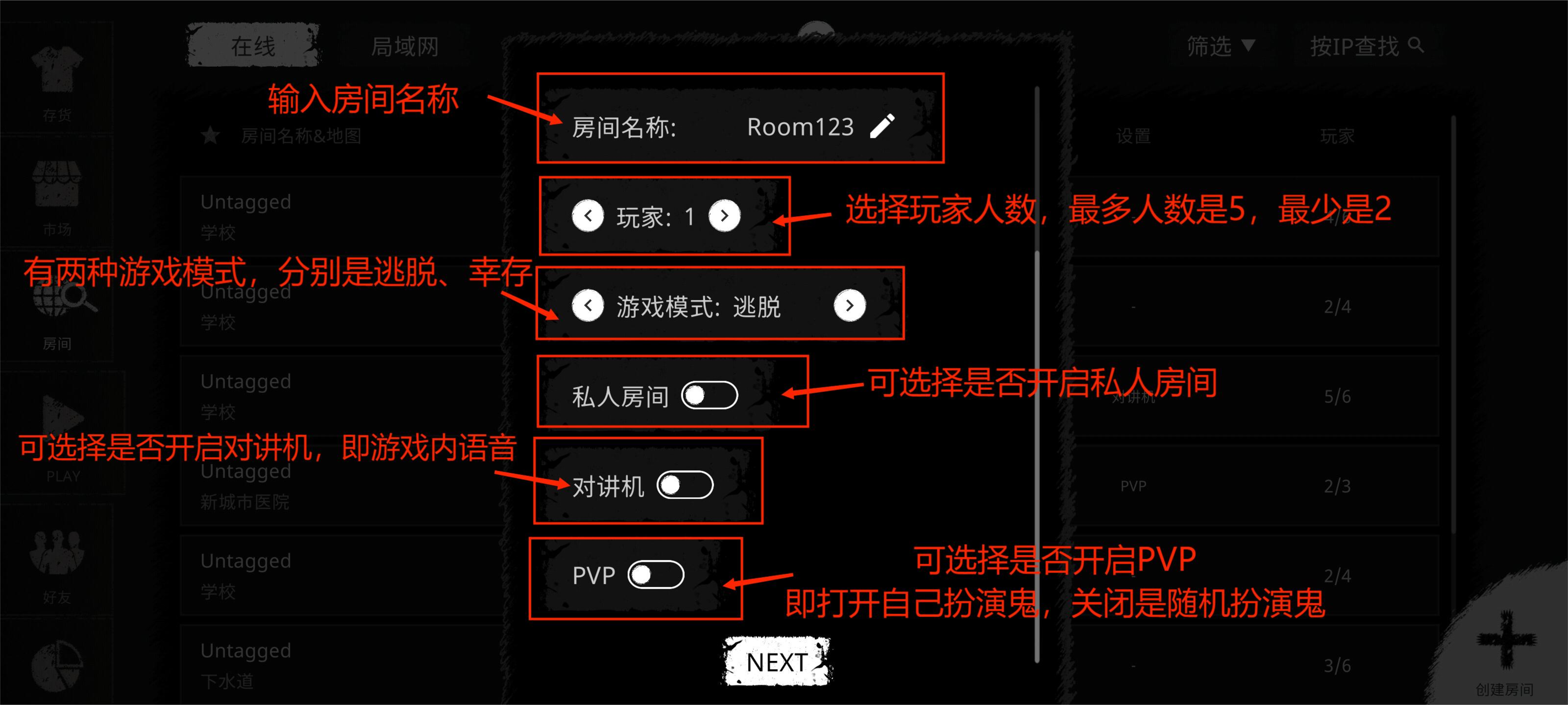 2.输入好房间名称,选择玩家人数、游戏模式以及选择是否开启私人房间、对讲机、PVP,默认是不开启的;然后点击‘NEXT’