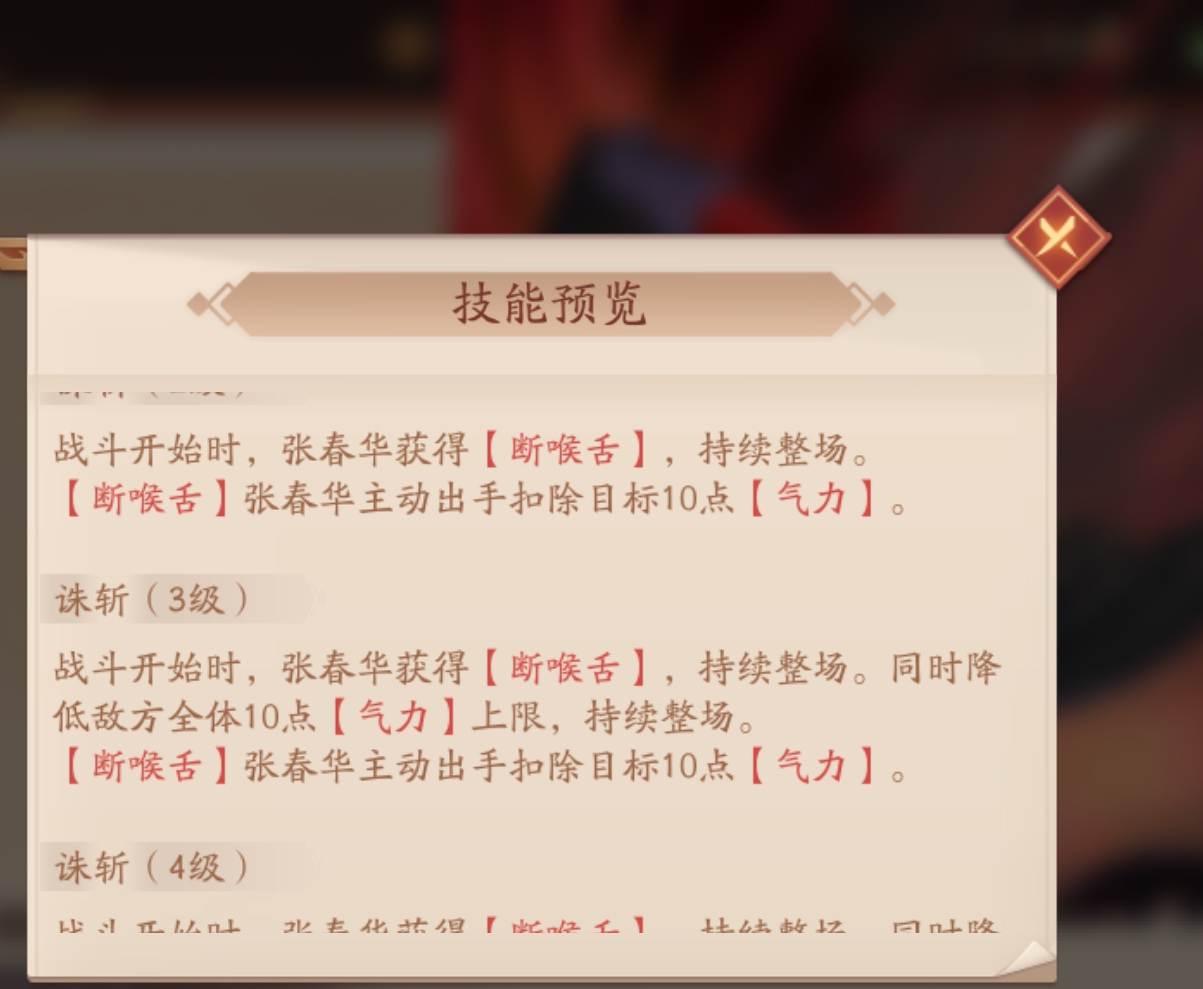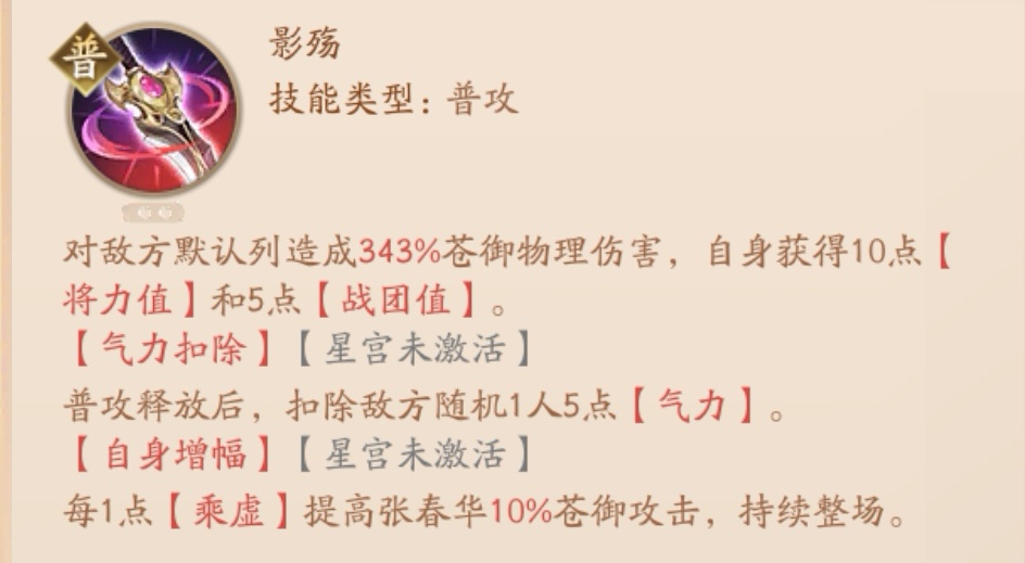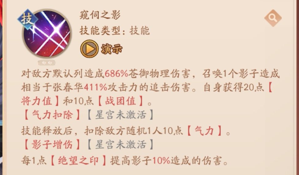 核心被动:战斗开始时,显露敌方全体“气力”,初始100点,敌方武将每次主动出手时扣除自身5点“气力”,张春华影子追击扣除目标10点“气力”。自身“气力”每下降10点,降低自身3%苍御攻击,“气力”达到0时,只能造成普攻,持续1回合,之后“气力”重新恢复上限。