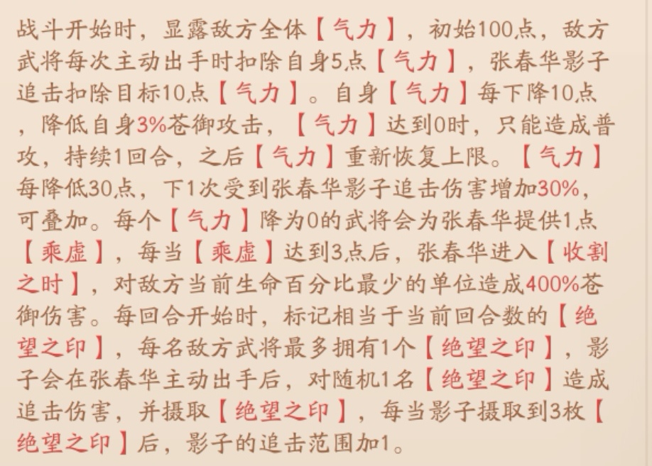 “气力”每降低30点,下1次受到张春华影子追击伤害增加30%,可叠加。每个“气力”降为0的武将会为张春华提供1点“乘虚”,每当“乘虚”达到3点后,张春华进入“收割之时”(对敌方当前生命百分比最少的单位造成400%苍御伤害。)