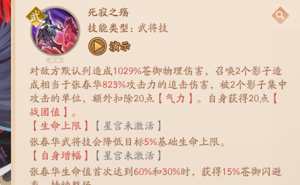 星宫2:自身增幅(张春华生命值首次达到60%和30%时,获得15%苍御闪避,持续整场)