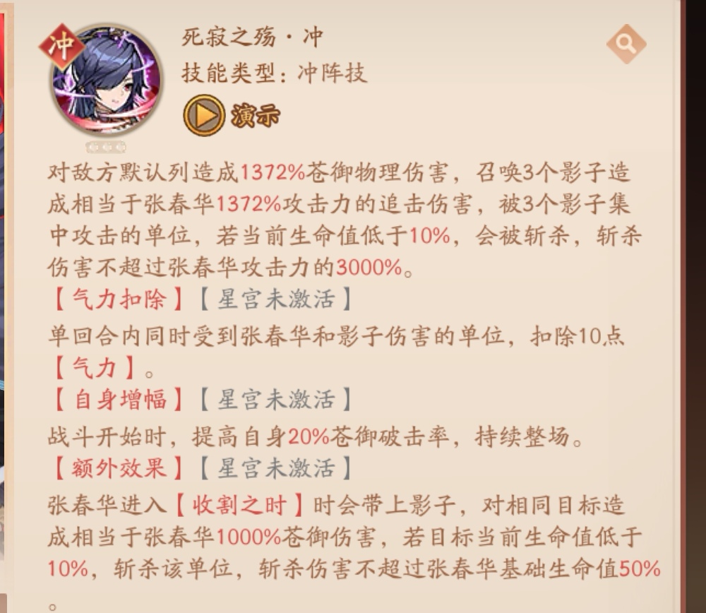 星宫3:额外效果(张春华进入“收割之时”时会带上影子,对相同目标造成相当于张春华1000%苍御伤害,若目标当前生命值低于10%,斩杀该单位,斩杀伤害不超过张春华基础生命值50%)
