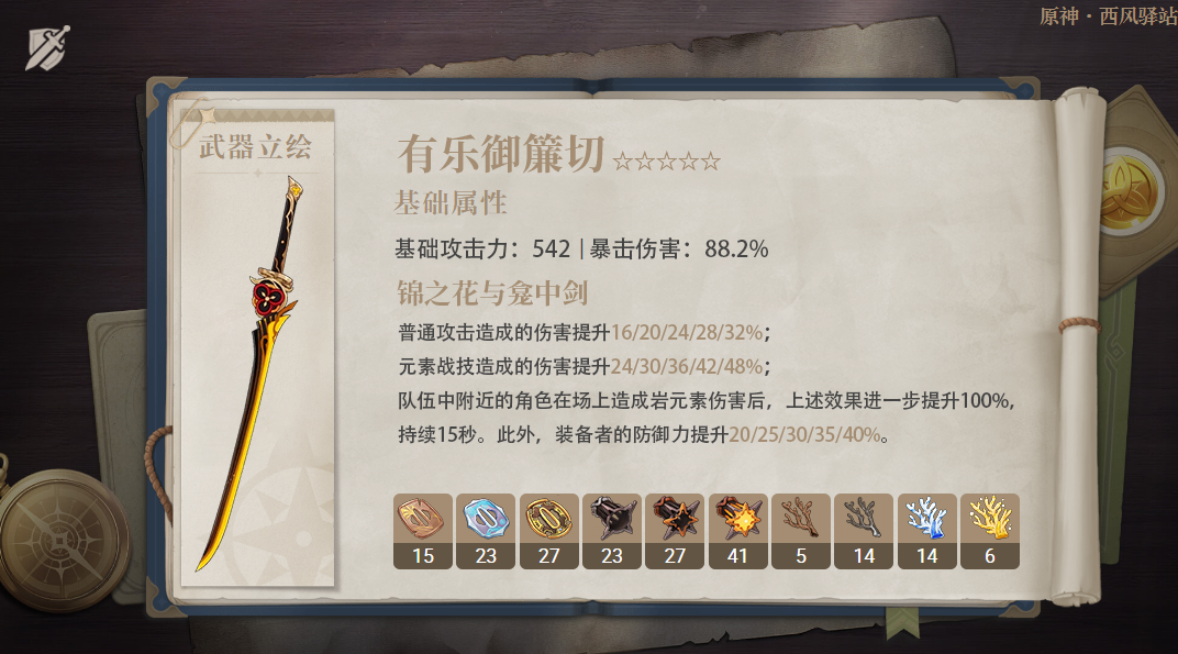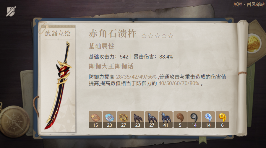 装备评价:该武器是五星单手剑中,继「雾切之回光」以后又一把强度与角色泛用性并存的武器,基础攻击力542与副词缀88.2%暴击伤害的设计基本上适用于所有输出向单手剑角色,触发武器特效的情况下,具有较高权重元素战技/普通攻击伤害加成,这两种伤害类型对许多单手剑角色来说均能利用。此外,武器特效的触发(指增伤效果提升100%)仅需搭配1名岩元素角色即可,易用性也很强。(除了防御力加成很多角色用不上以外,基本没有缺点)