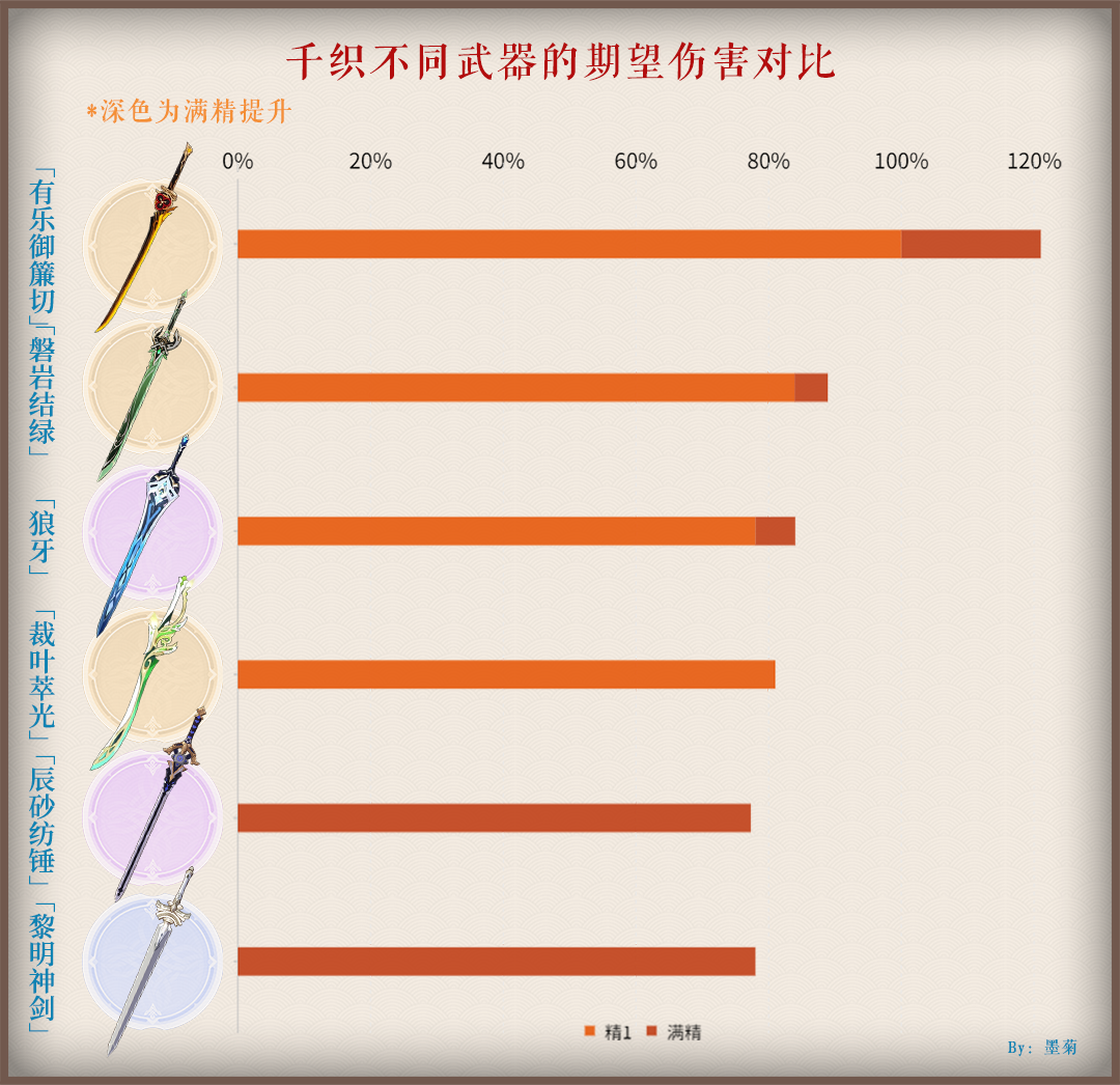 「千织」:作为同期up角色,千织自身为岩元素角色,能够轻松触发武器效果,且千织伤害构成以元素战技为主,自身伤害倍率以“防御力”为核心属性,无论在机制还是外观上与该武器均有极高的契合度,是当之无愧的毕业武器