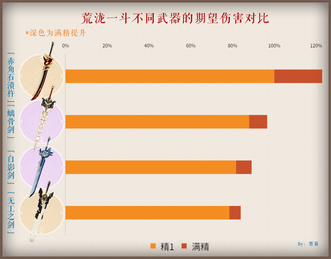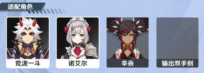 「荒泷一斗」:与这把武器一同up的双手剑角色,输出方式主要为“重击”,且有着防御转攻击的额外防御收益,自身固有天赋也能依据防御力对重击进行伤害值提升,搭配该武器,有着防御力上的三重收益