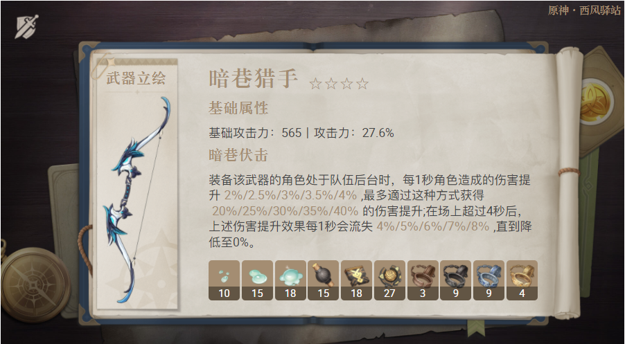 装备评价:暗巷系列的弓系武器,许多副C弓系角色都能佩戴的较强力武器,能够稳定提升佩戴角色在后台的伤害。切换至前台施放技能时也能保持一段时间来保证出伤,是非常优秀的四星限定弓,自初次登场以来,在四星副C中一直是较优选择,可惜是限定四星武器,不然应该会有更好的评价