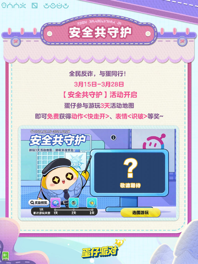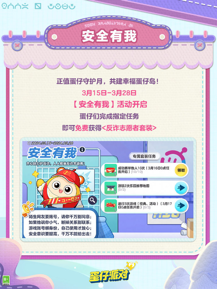鸡蛋鸭蛋荷包蛋,不做被骗小傻蛋!光环-小Y发布于 2024-03-15关注正值蛋仔守护月,快和皮蛋一起做反诈志愿者、共建幸福蛋仔岛!3月15日-3月28日,蛋仔们在【安全有我】活动中完成指定任务,即可免费获得<反诈志愿者套装>! 3月15日-3月28日,【安全共守护】活动开启,参与游玩3天活动地图,即可免费获得动作<快走开>、表情<识破>等奖励~