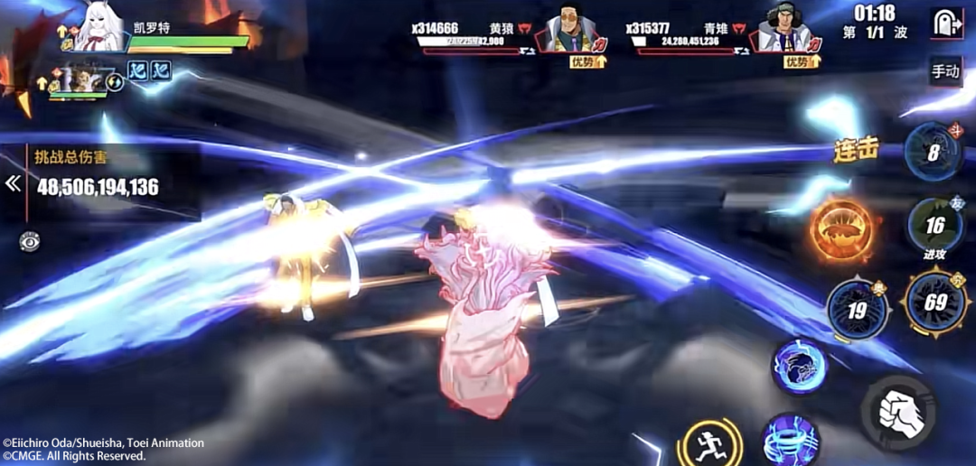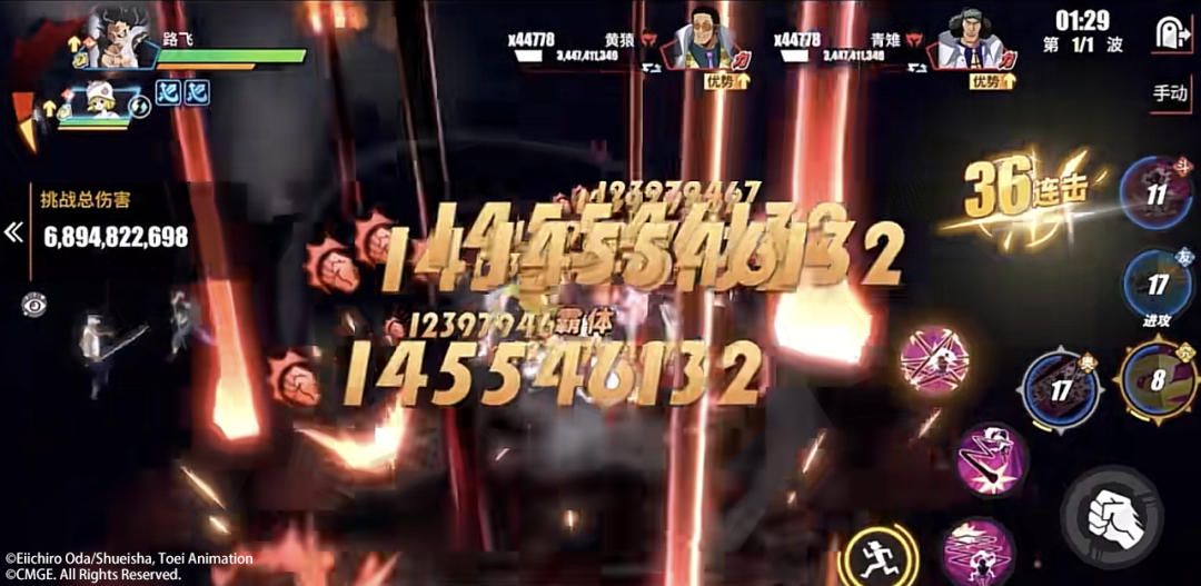 2.四挡·蛇人·路飞的核心输出技能是激斗(霸王色)、小奥义、1技能3替换黑色蛇群。激斗一般在奥义释放后再释放,以达到减少奥义cd的效果。