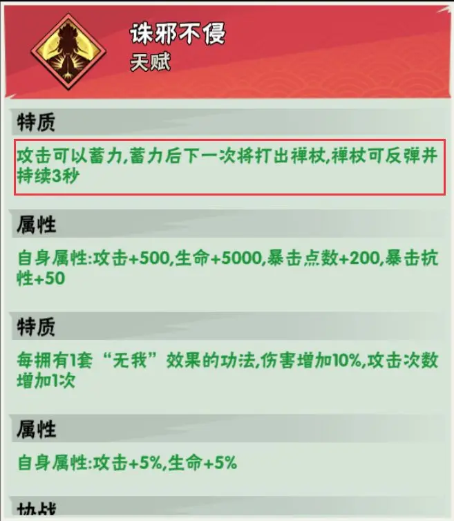 普通攻击为金虹,蓄力攻击为释放禅杖,禅杖具有无限穿透,触底回弹的特性,局内升至五重后,3把禅杖依靠回弹,可以轻松覆盖整个战场,比慕楚更好使。可作为医系侠客蓄力流主c。