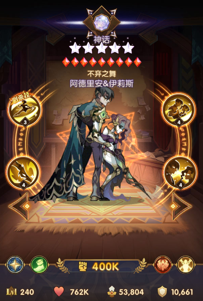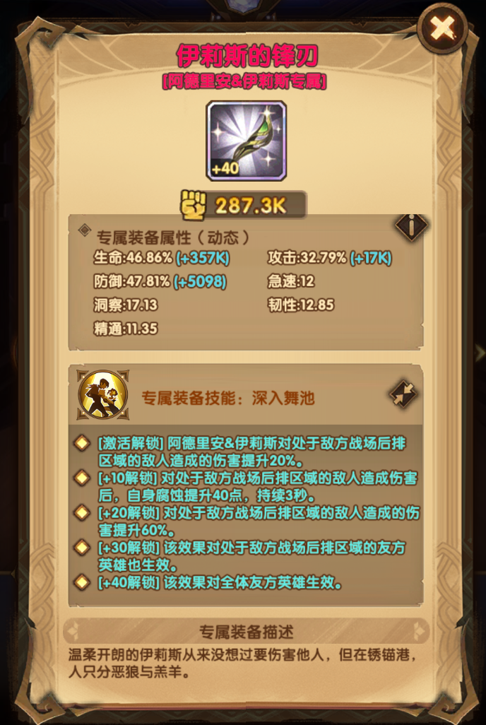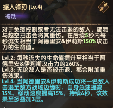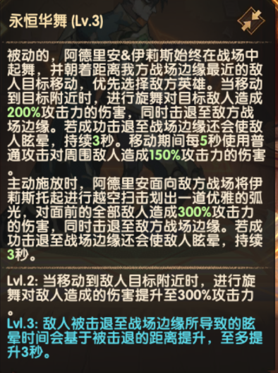 被动的,舞者在战场中起舞,并朝着距离我方战场边缘最近的敌人目标移动,优先选择敌方英雄。当移动到目标附近时,进行旋舞对目标敌人造成伤害,同时击退至敌方战场边缘。若成功击退至战场边缘还会使敌人眩晕。移动期间使用普通攻击对周围敌人造成伤害。
