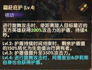 舞者的团队增益技能,自身与友军获得护盾,且溢出的护盾值会转化为治疗。