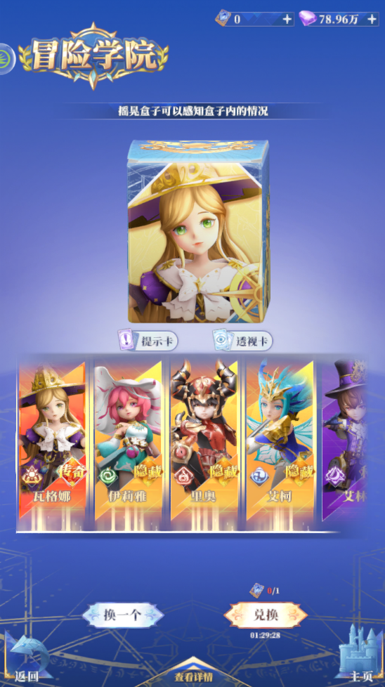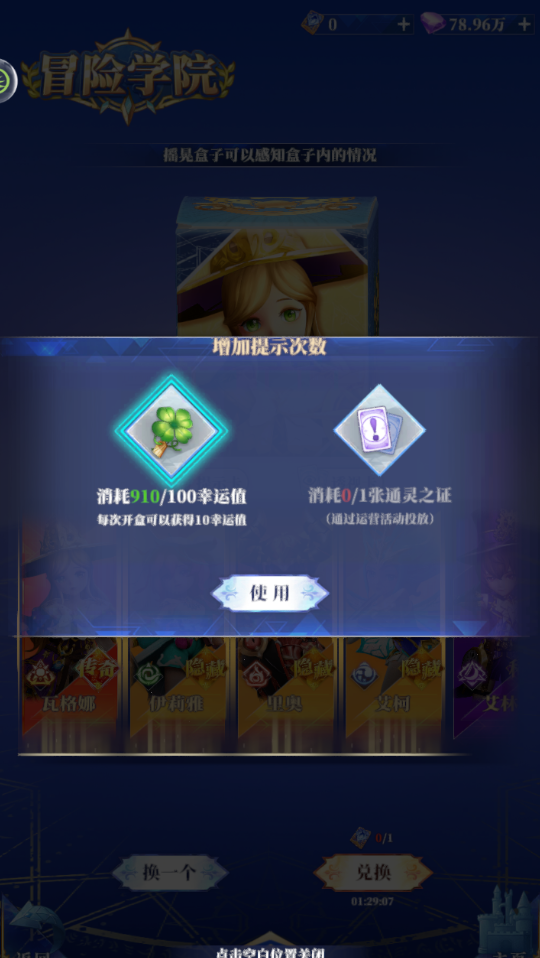 10.此外,为了增加发现隐藏商品的概率,您还可以点击盲盒消耗累计的幸运值材料使用提示卡,幸运值材料在每次抽取冒险学院盲盒时都会赠送。