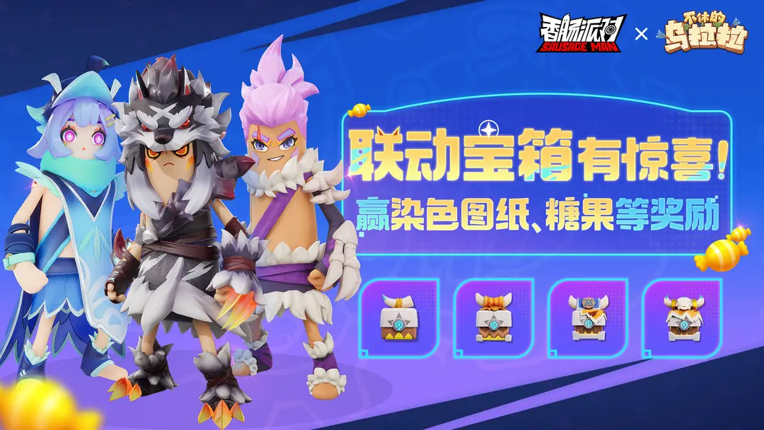 大家好,我是蛋卷~香肠派对×不休的乌拉拉 SS14联动赛季就要正式上线啦!为了庆祝联动赛季的到来,来自《不休的乌拉拉》的新朋友们还带来了特别的礼物「乌拉拉联动宝箱」!只要开启宝箱,就有机会获得染色图纸、糖果、坐骑饰品等奖励,快来和蛋卷一起看看吧~