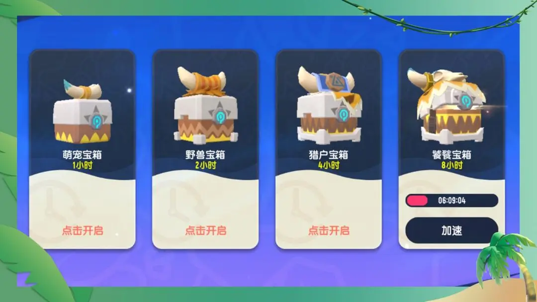 宝箱共分为4种,分别为开启时间为1小时的萌宠宝箱,开启时间为2小时的野兽宝箱,开启时间为4小时的猎户宝箱和开启时间为8小时的饕餮宝箱!