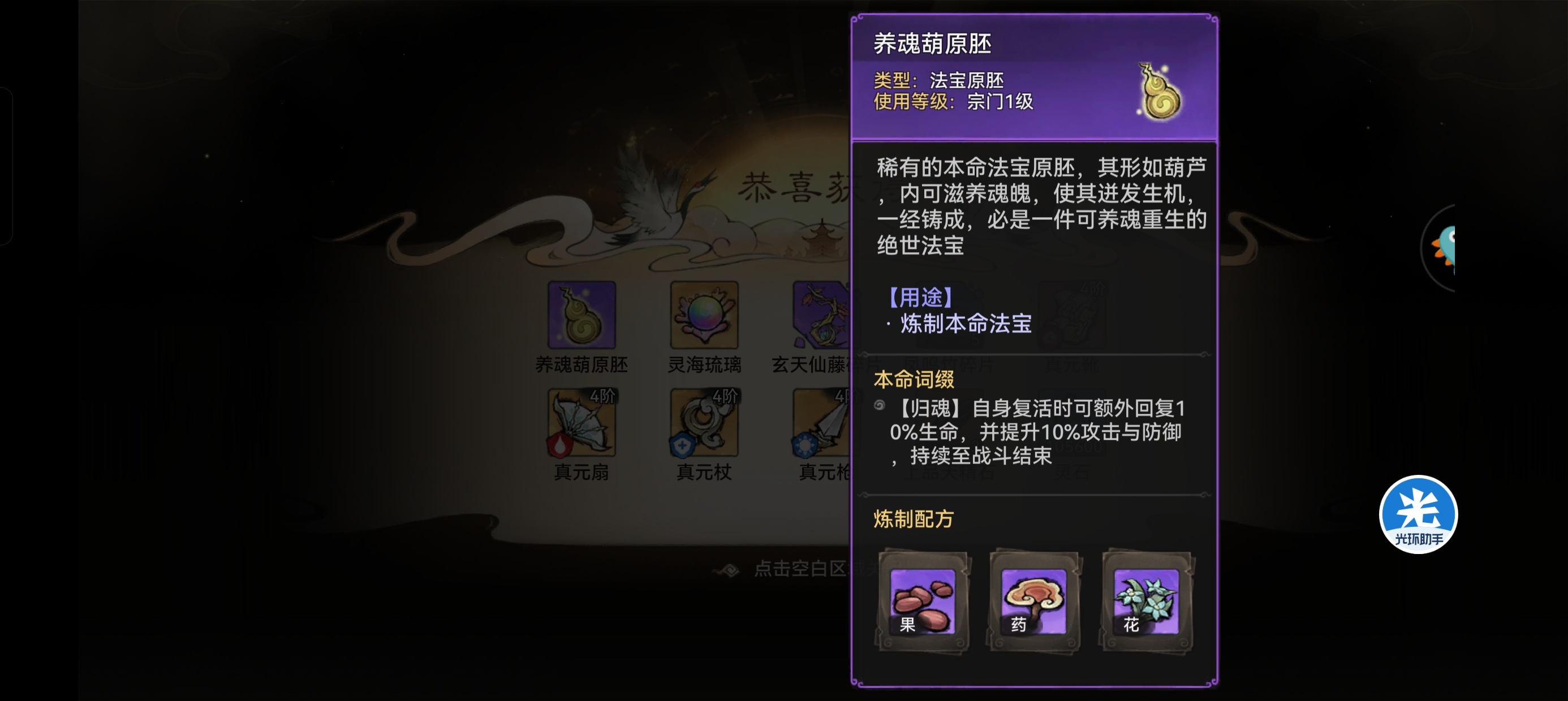 比如:【紫色的本命胚子】需要3件紫色的法宝炼化。