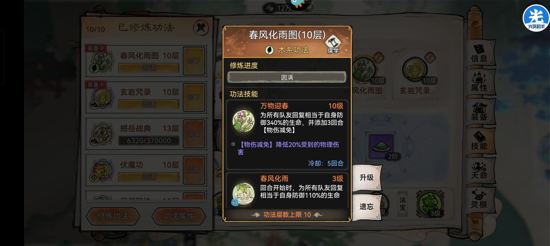 狮子推荐首选【春风化雨图】这个治疗功法大家都有人手一个,而且春风花雨图每回合开局都能够自动治疗全体队友,可以说打这个副本是极其友好的。