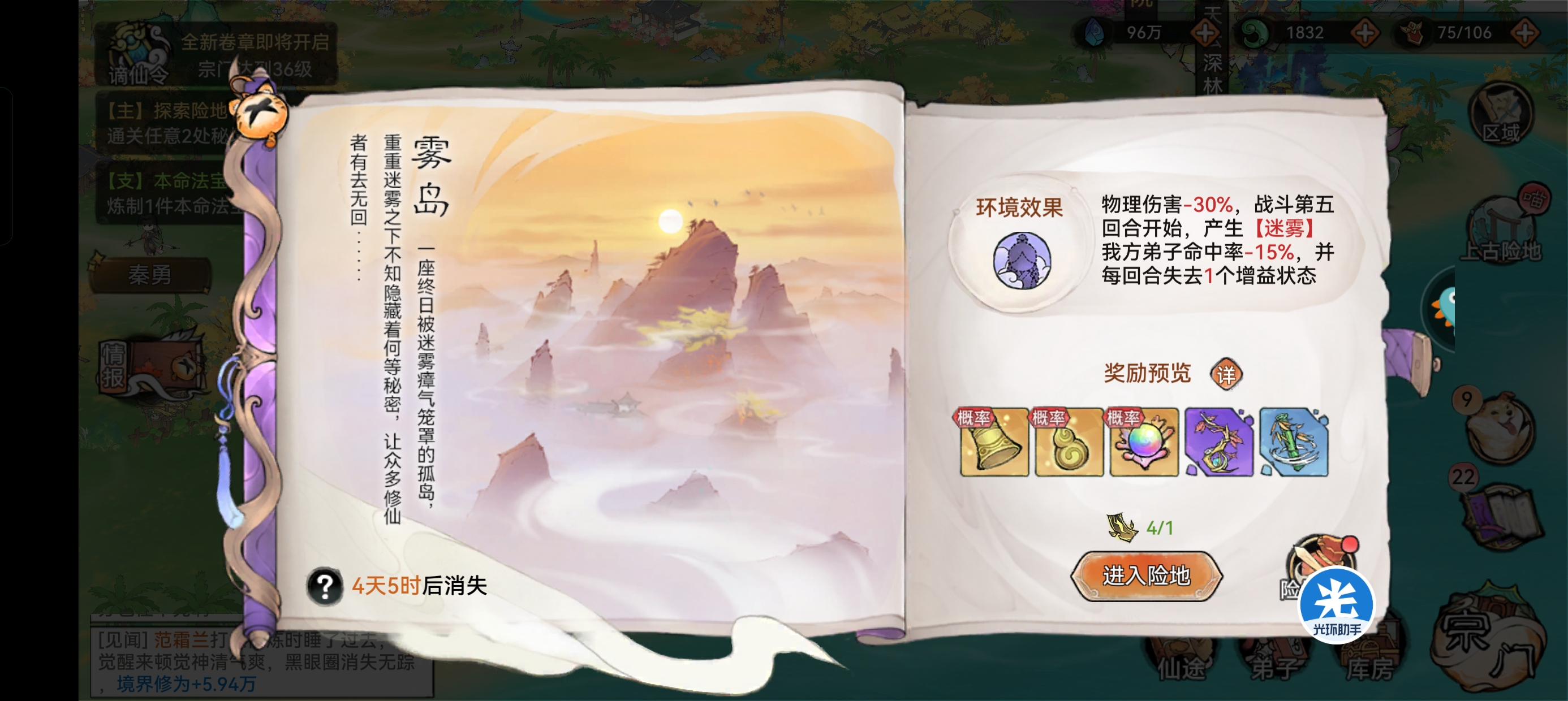 二:【上古险地】的注意事项。上古险地主要是获得我们【本命法宝】胚子和法宝强化材料的地方。期间还可以获得一些装备和3阶法宝材料等,而且很容易出高品质的装备。