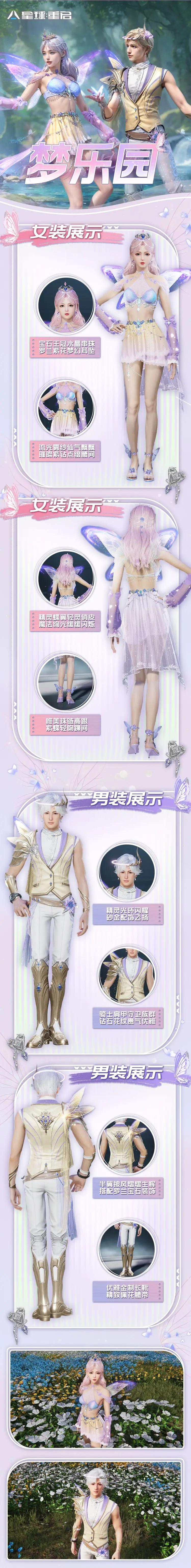 在独属于我们的梦乐园里尽情飞舞。「梦乐园」时装包含发饰、上衣、下衣、手部和鞋子共五个部位,女款为俏皮可爱的精灵公主,宝石与纱裙光彩夺目,男款则更加内敛,像是一位默默守护的精灵骑士。