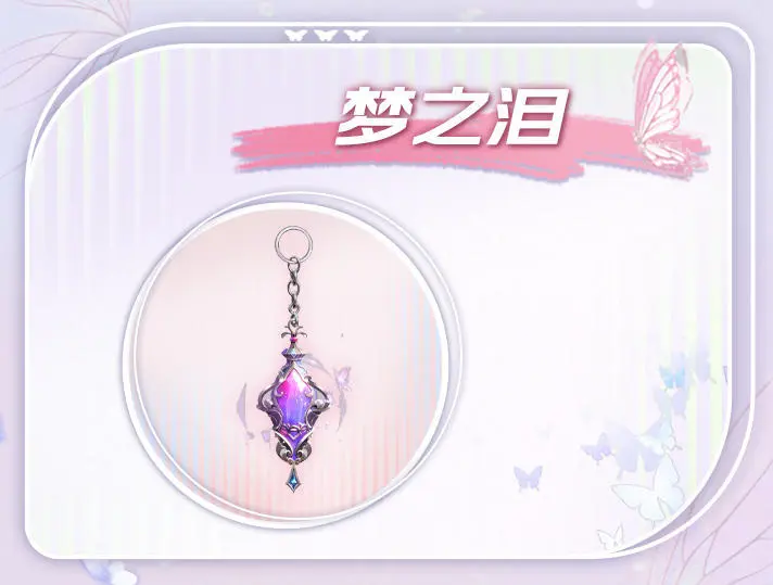 背包挂件「梦之泪」由蓝紫宝石打磨而成,蝴蝶光效若隐若现。