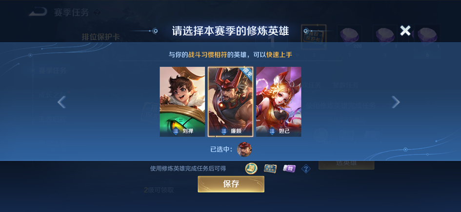 4、修炼任务,从推荐英雄中选出“赛季修炼英雄”,使用修炼英雄完成5v5对局,可完成修炼任务,每个赛季最多可以主动选择3个修炼英雄。