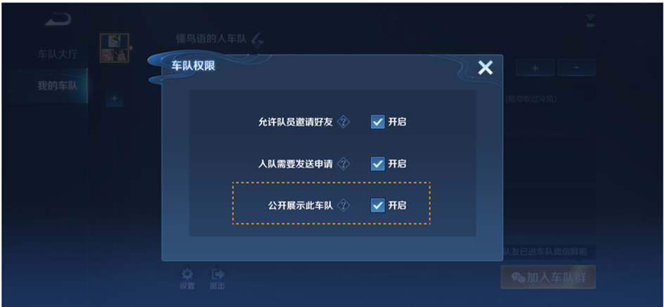 新增公开此车队设置,默认为打开,关闭设置后,将不会推荐给好友展示,玩家个人名片中也不会展示该车队