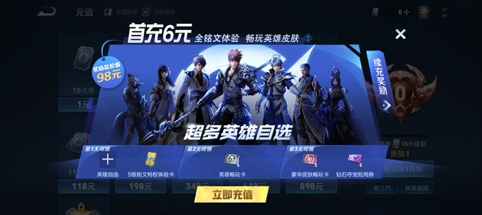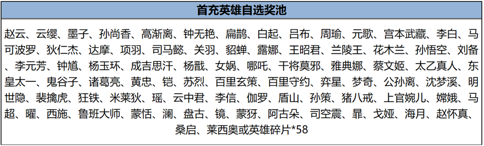 完成首充后,可立即选择奖池中任一英雄和5级铭文体验卡(14天)进行领取。