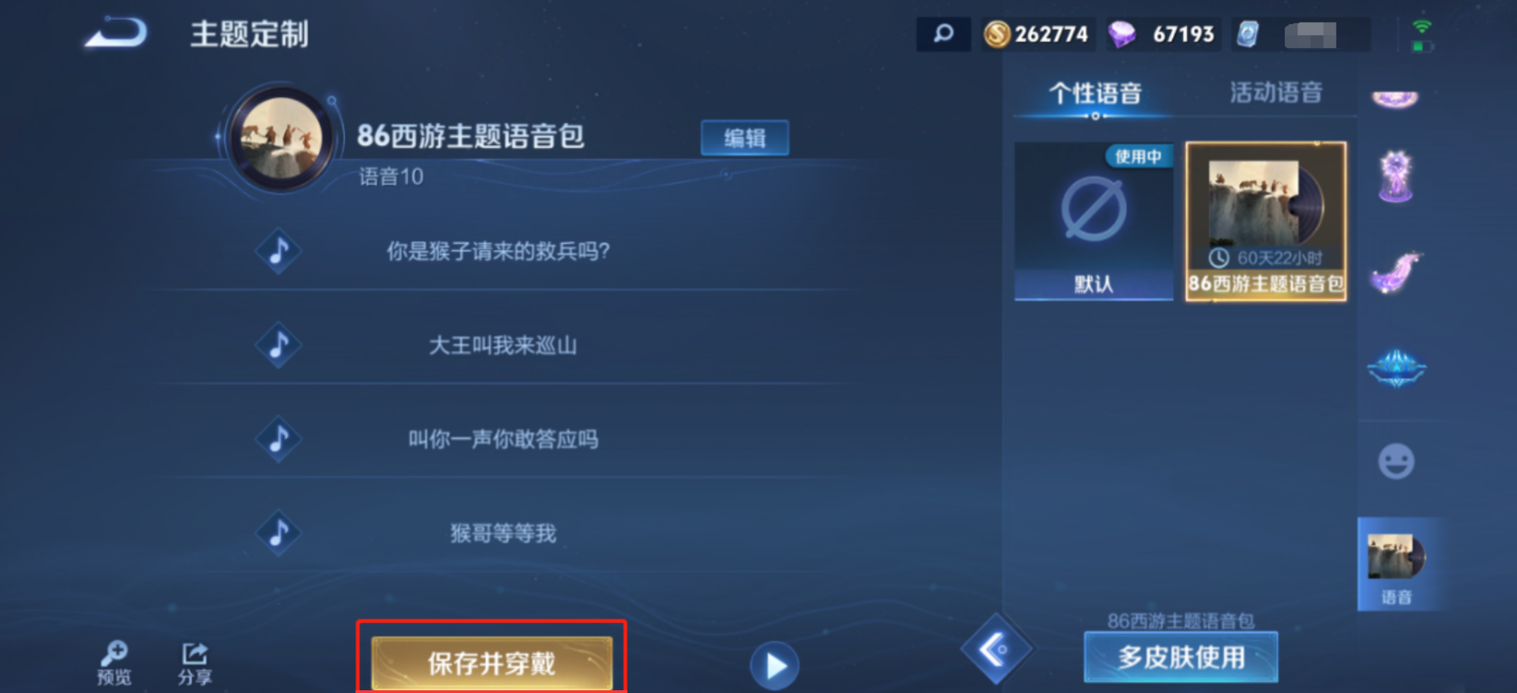 在定制-皮肤定制-我的-主题定制中,可进入到个性语音与活动语音等以趣味体验为主的语音编辑优化区域(趣味内容存于此处,与备战语音有区分,不易混淆,编辑更便捷)