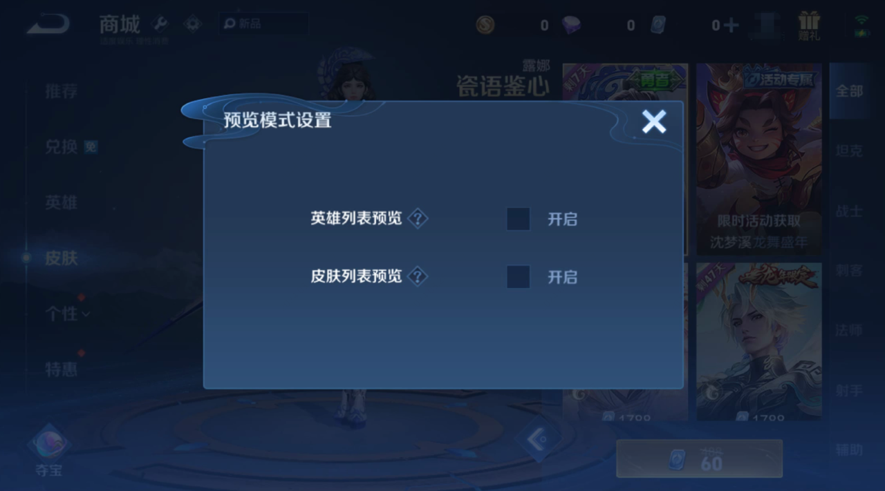 英雄/皮肤切页上方的【设置】内,可进行列表模式预览选项的勾选,勾选后将使用列表的形式浏览英雄、皮肤相关内容;