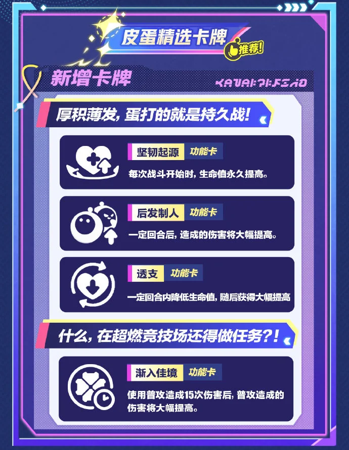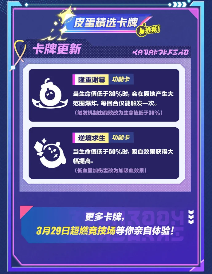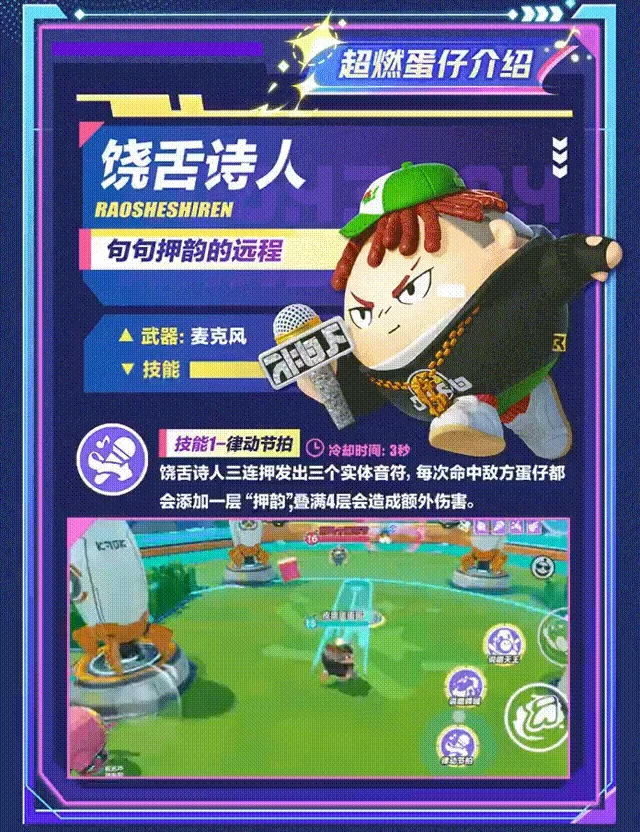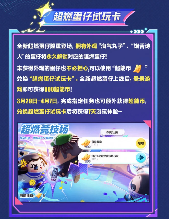竞技浮空岛战斗不停,【超燃竞技场】热血上新!光环-小Y发布于 2024-03-27关注3月29日,超燃蛋仔“淘气丸子”、“饶舌诗人”登场!全新25张功能卡、18张专属英雄卡和5张属性卡为对局再添助力~拥有外观“淘气丸子”、“饶舌诗人”的蛋仔将永久解锁对应的超燃蛋仔!未获得外观的蛋仔也不必担心——可以使用“超能币”兑换“超燃蛋仔试玩卡”。全新超燃蛋仔上线后,登录游戏即可获得800超能币!超燃蛋仔迅速集结,享受劲爽战斗体验!