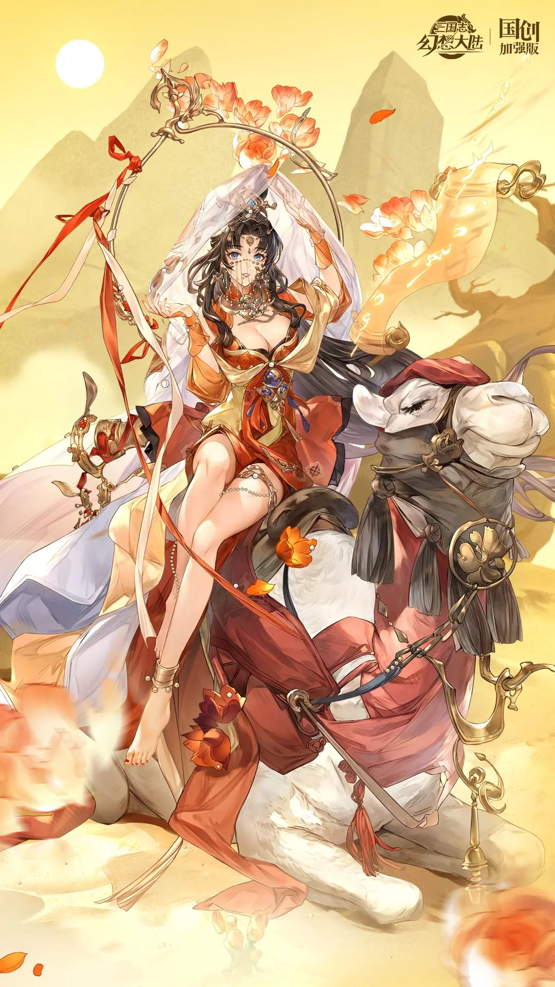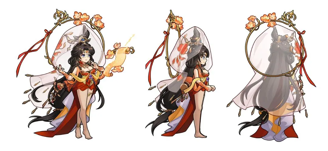 皮肤以西域风情为主要灵感,茫茫沙漠中辛宪英一袭红裙,头戴白纱,原本的面纱也在此次设计中替换成珍珠流苏面纱,这也点明了她魏国贵女的身份。除了服装外,她坐着的骆驼也是此次皮肤中的亮点,精美别致的驼铃和缰绳更显得她高贵端庄。