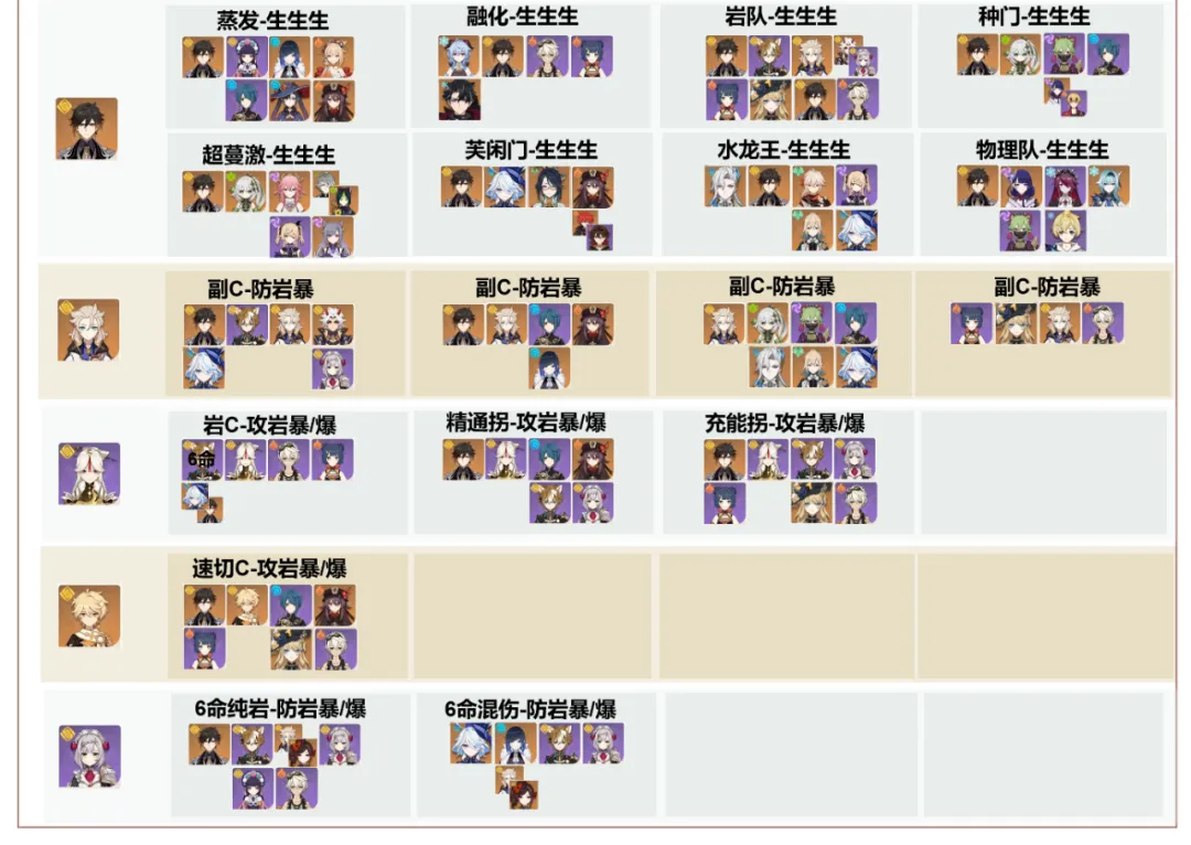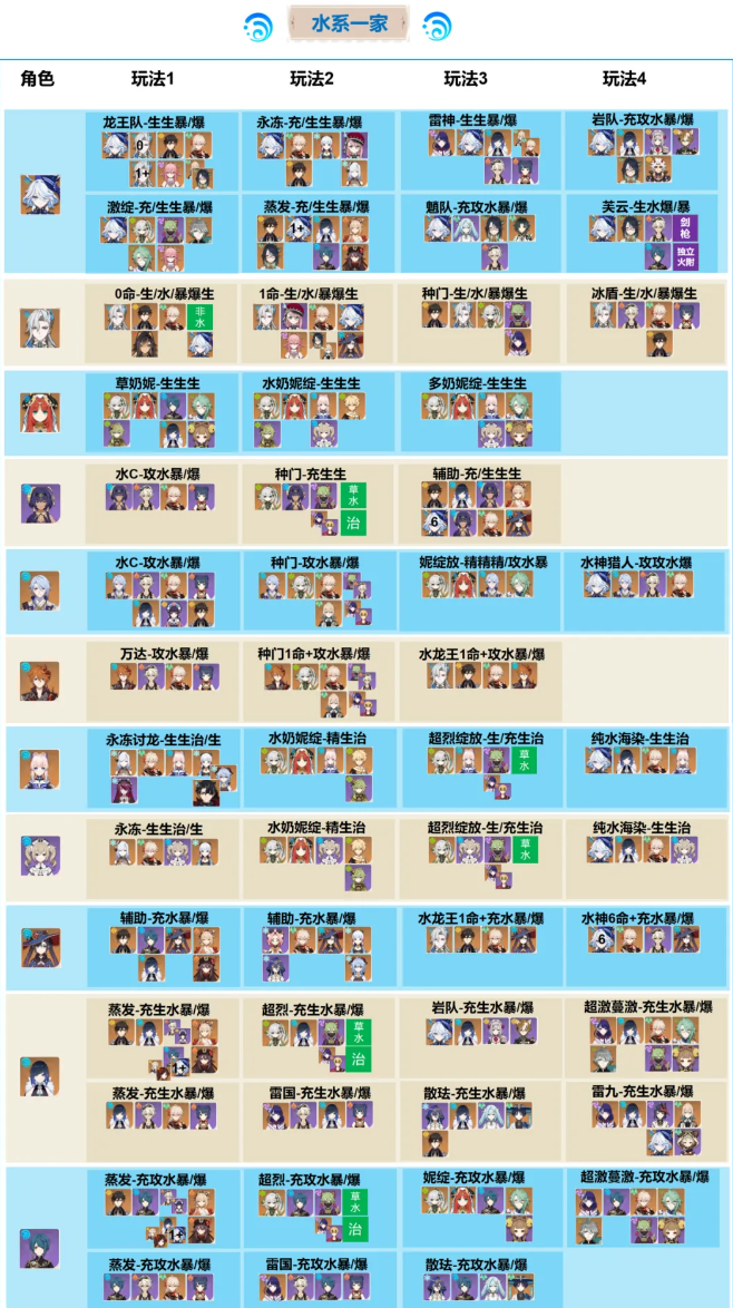 水系夜兰绫人心海等、雷系神子皇女赛诺、草系全体、冰系迪奥娜修女、风系万叶砂糖、火系托马胡桃等、岩系钟离阿贝多;