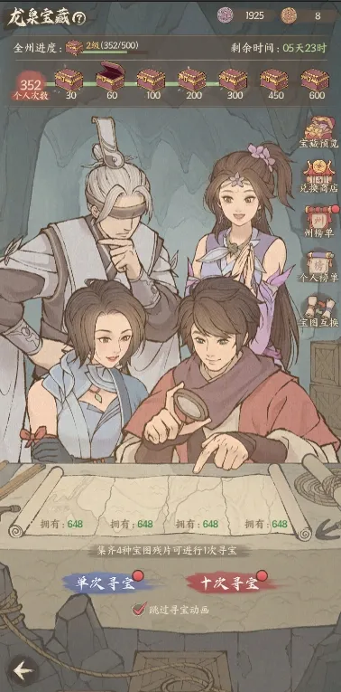 诸位大人将以藏宝图为凭证,踏上寻宝之旅!大人们可通过收集藏宝图碎片,兑换联动异客·姬如雪、联动客卿·张子凡、联动座驾皮肤-龙泉宝驾、火喵三丈头像、橙品客卿万能碎片、自选橙马蹄金等珍贵奖励!活动结束前,个人排行榜单前三的大人,将获得「龙泉宝主」联动称号。