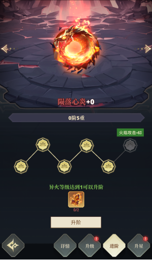 进阶需要消耗火灵石,每次都能提升异火的对应能力,火灵石的来源是洞府阵盘跟每周礼包,当点到最后一格需要消耗火灵焚晶,火灵焚晶的来源也是洞府阵盘和每周礼包。