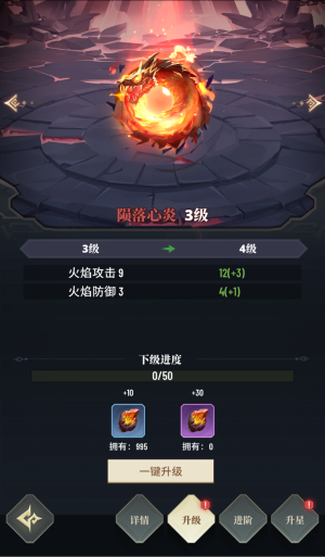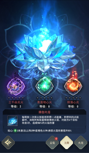 游戏同时最多上阵三种不同的异火,异火的培养分为了升级、进阶、升星,升级可以提升异火本身的火焰攻击跟火焰防御,需要消耗蓝色或紫色炎石,蓝色炎石+10进度、紫色+30进度,炎石主要来源是洞府阵盘跟宝玉阁。