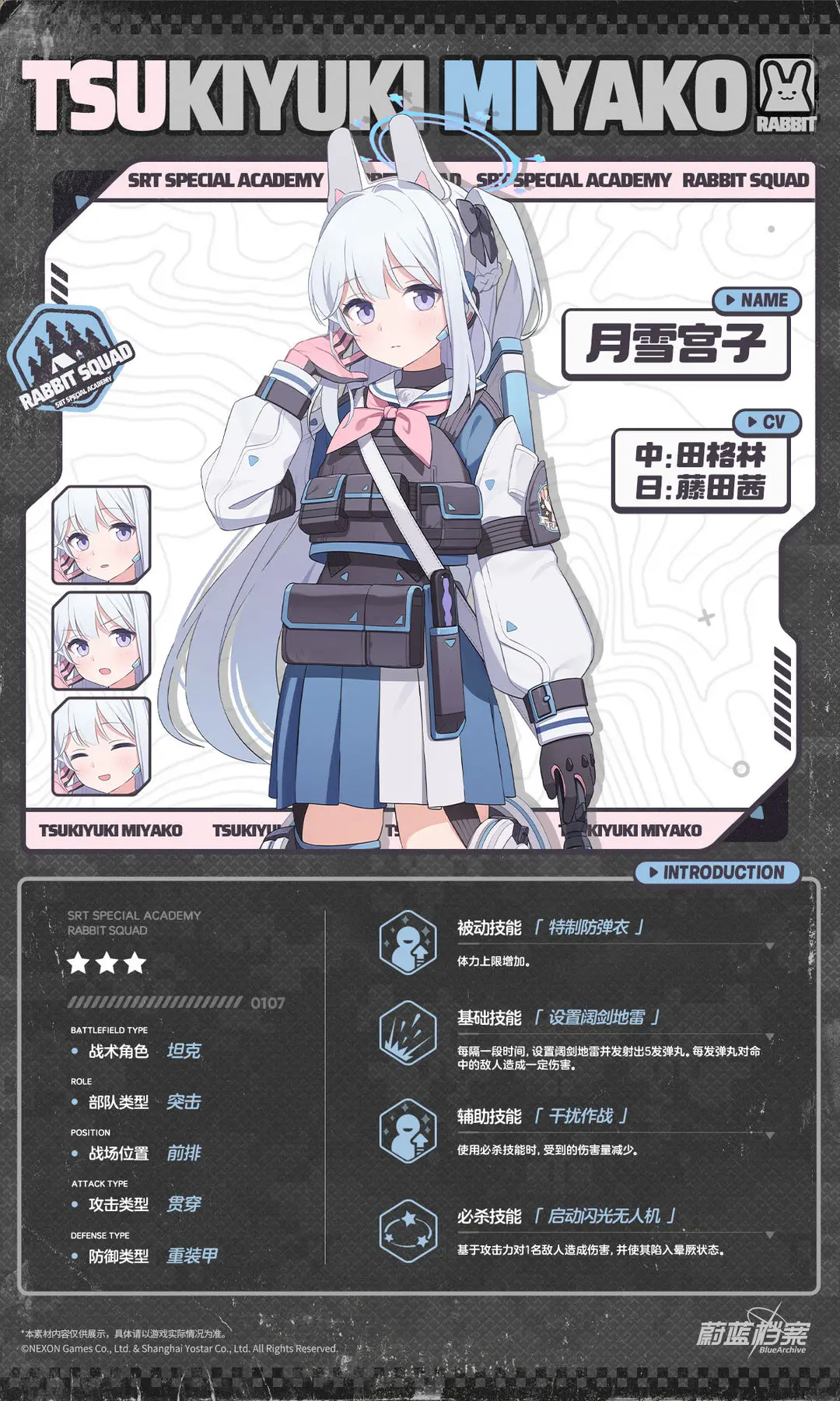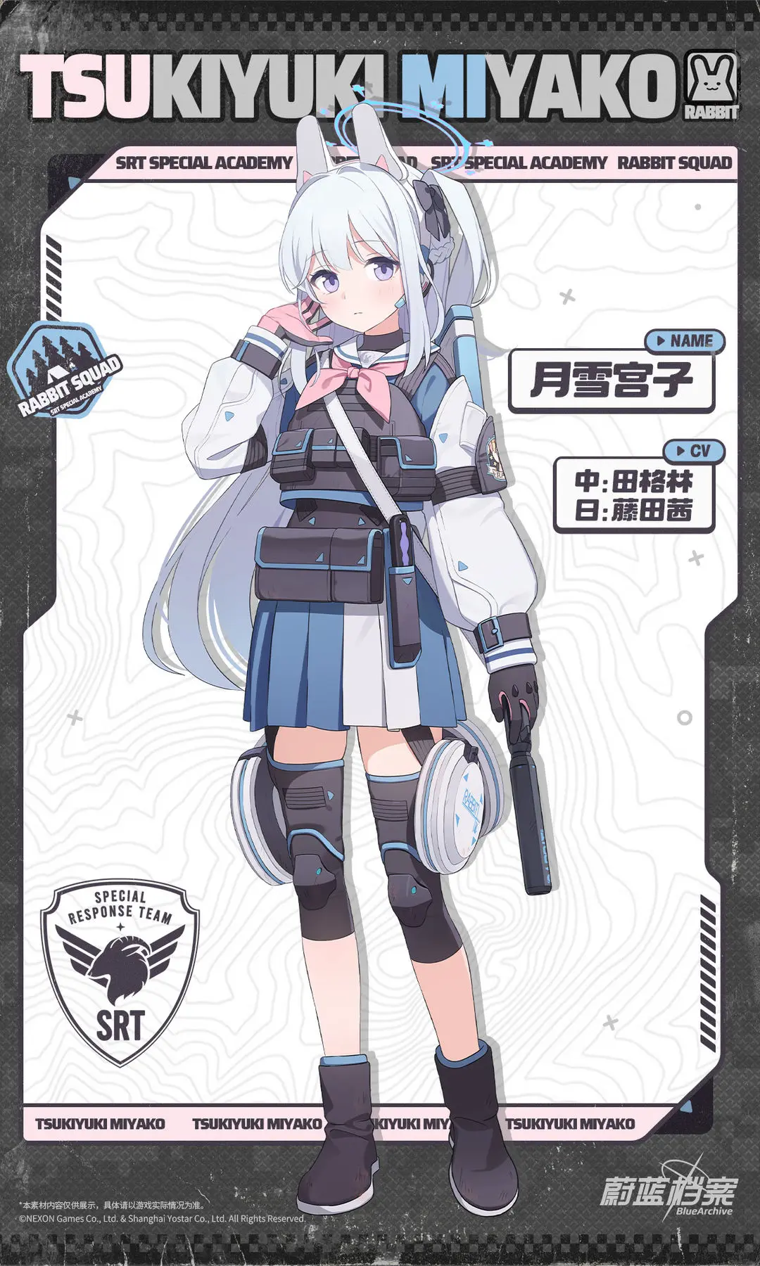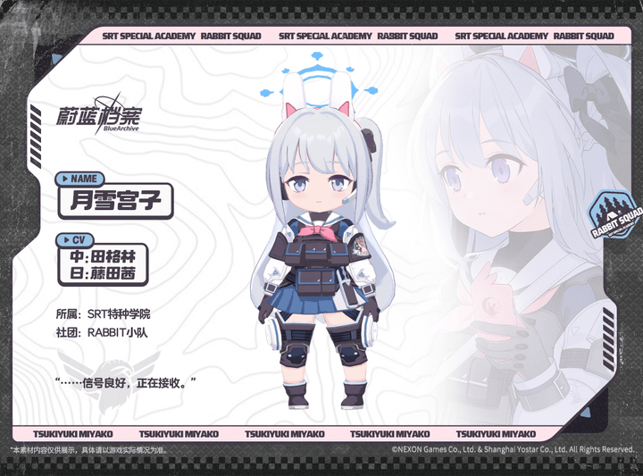 【人物档案】月雪宫子光环资讯 - 二次元发布于 2024-03-29关注 //////////档案启封//////////■ 月雪宫子SRT特种学院所属,RABBIT小队的队长,呼号【RABBIT 1】。憧憬着心怀正义作战的前辈们,宫子加入了SRT特种学院。但学院突然关闭后,她只好与小队队员一起在公园里风餐露宿。因为总是冷着一张脸也很少表达自己的感情,所以会被其他人误以为生性冷漠。但事实上,她一直温柔地关心着小队中的每一位成员。“为了不辜负您的期待,我会更加努力的。”