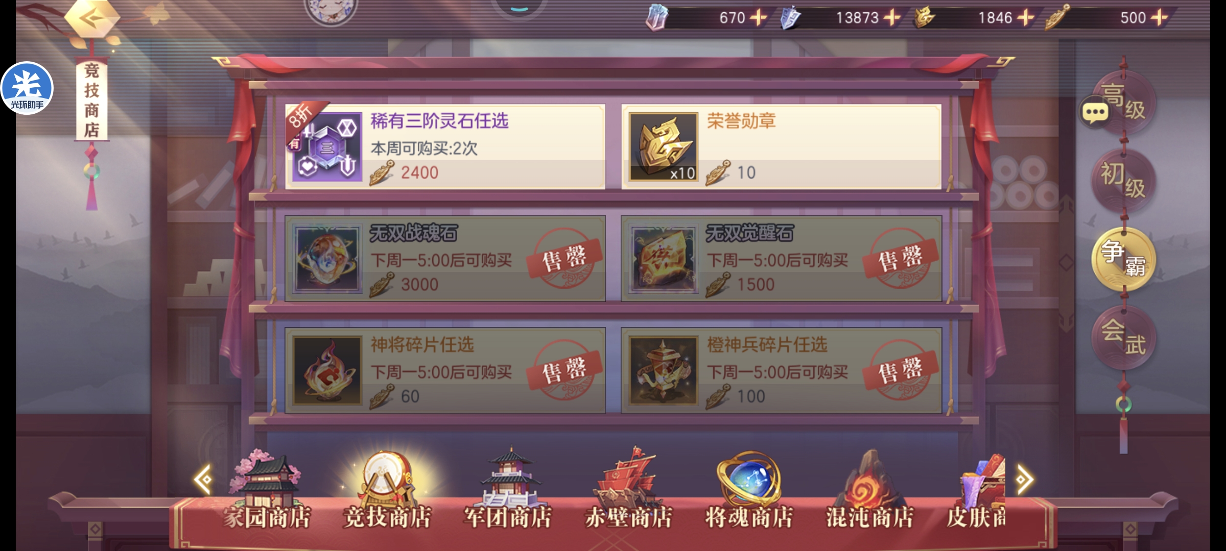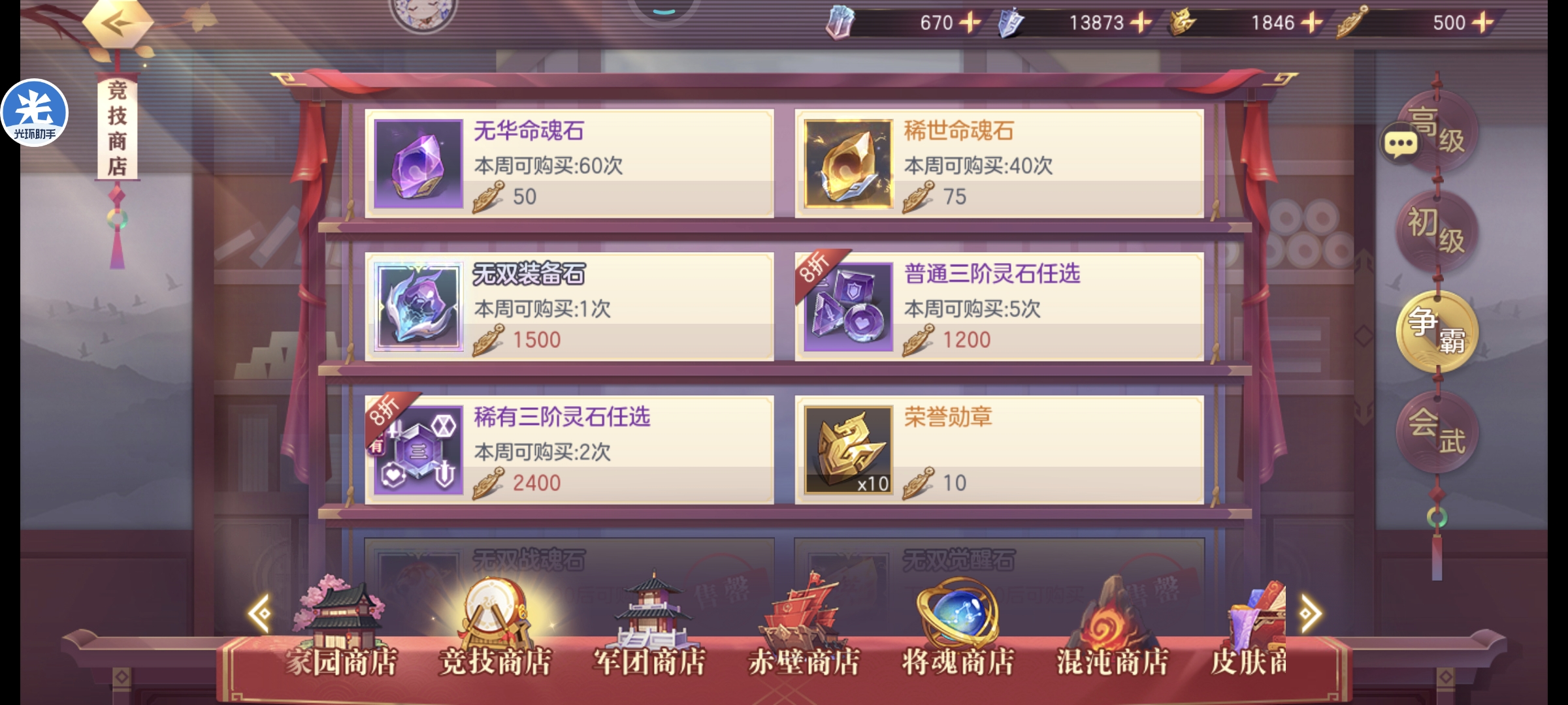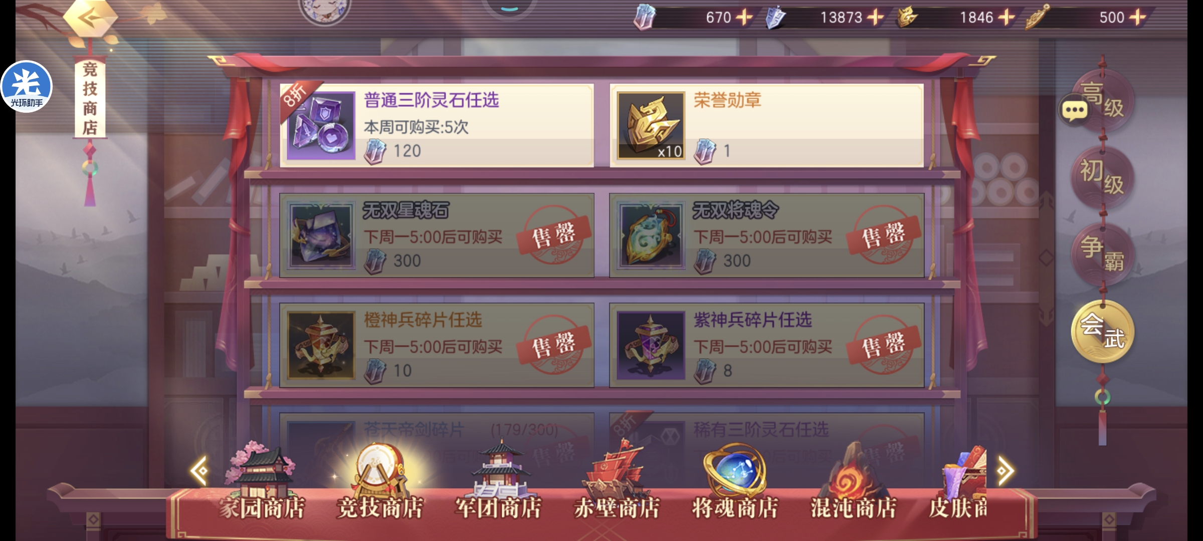 会武商店基本都可以拉满,但是如果想拿满高级商店的资源荣誉勋章是不够的,舍弃狗粮普通灵石拿会武币兑换荣誉勋章即可,优先高级商店,元宝永不过时注:稀有灵石优先铁壁和锋锐