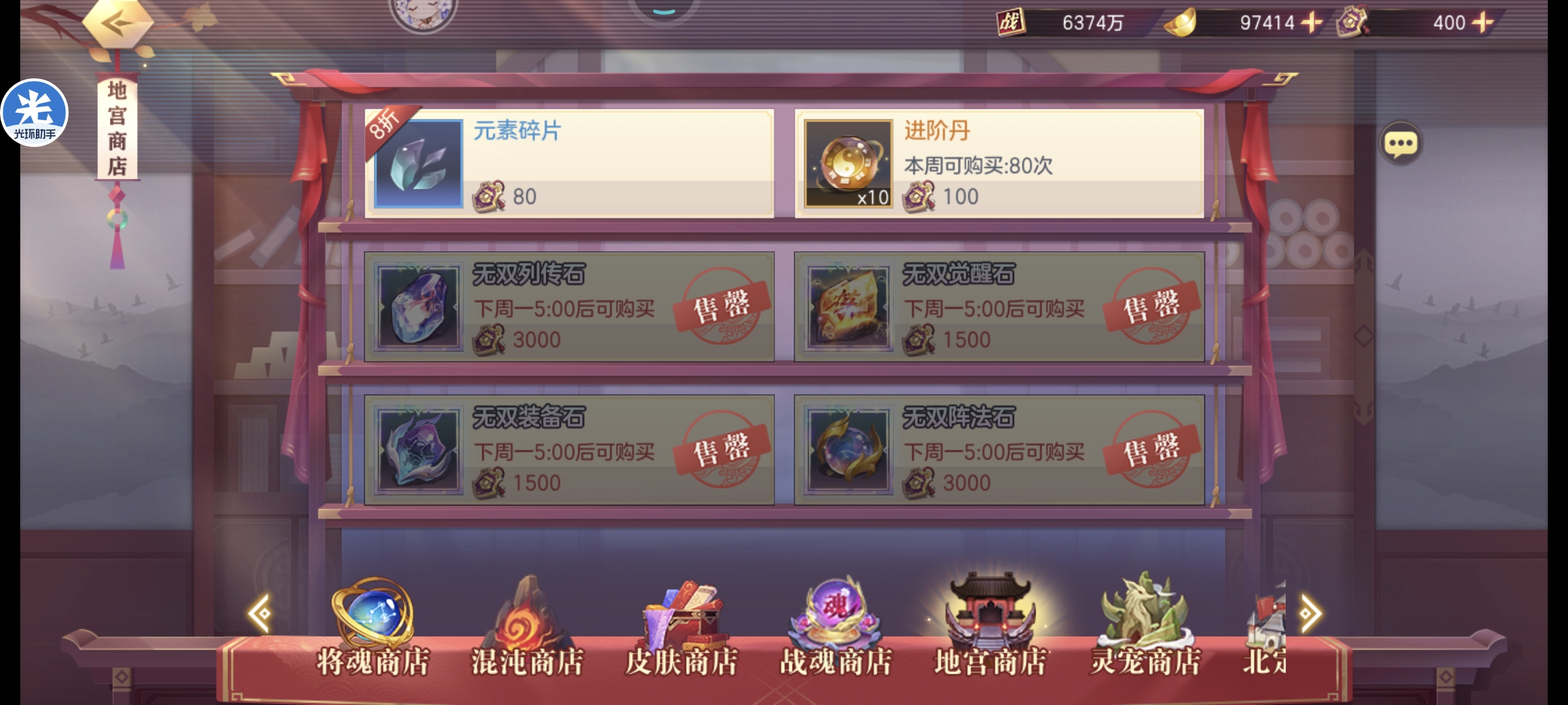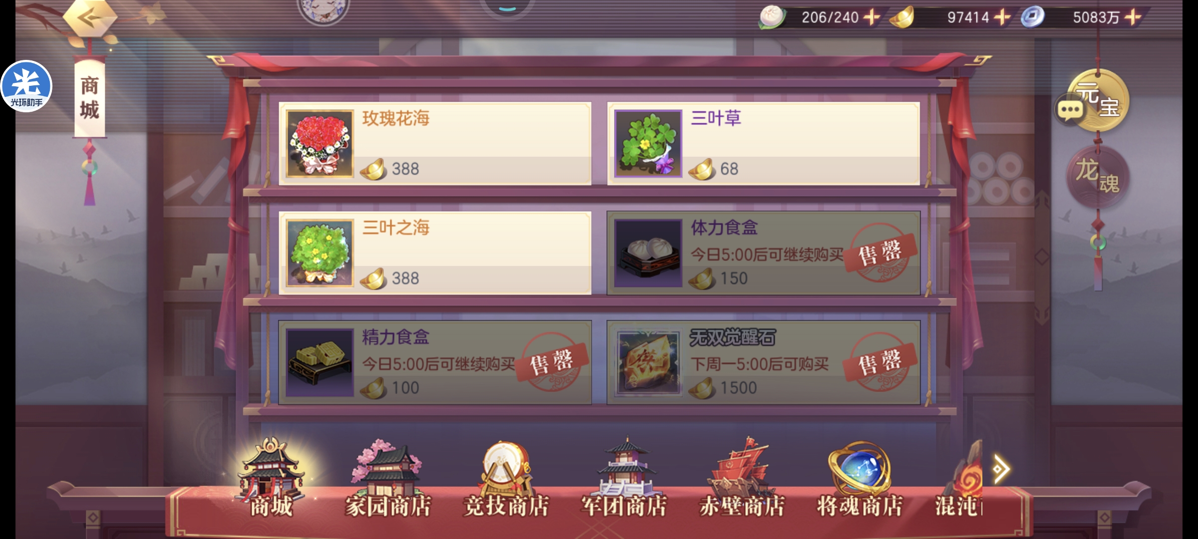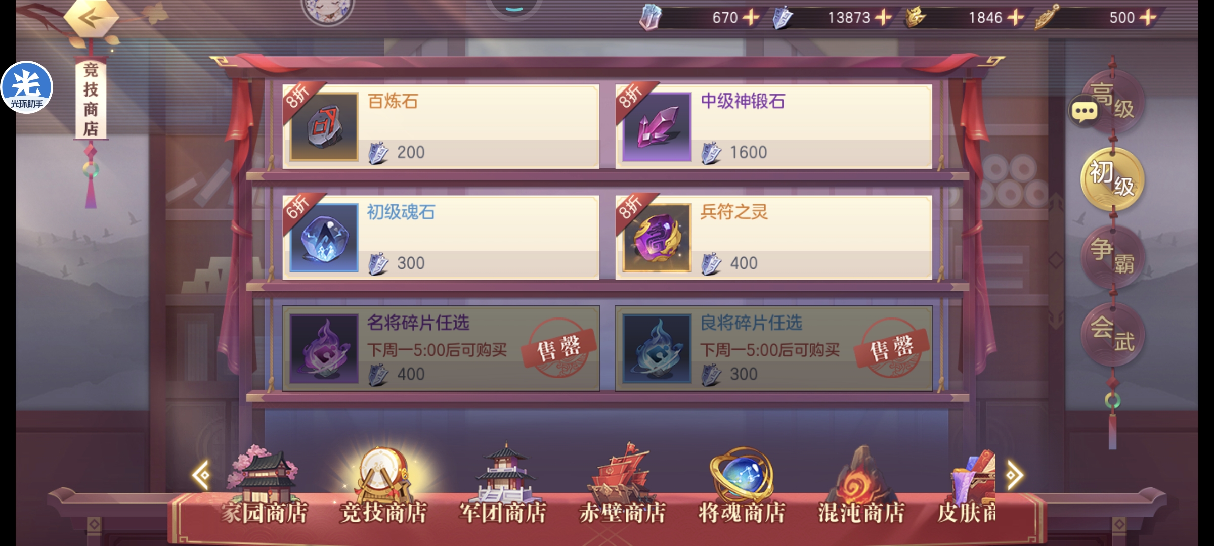会武商店基本都可以拉满,但是如果想拿满高级商店的资源荣誉勋章是不够的,舍弃狗粮普通灵石拿会武币兑换荣誉勋章即可,优先高级商店,元宝永不过时注:稀有灵石优先铁壁和锋锐