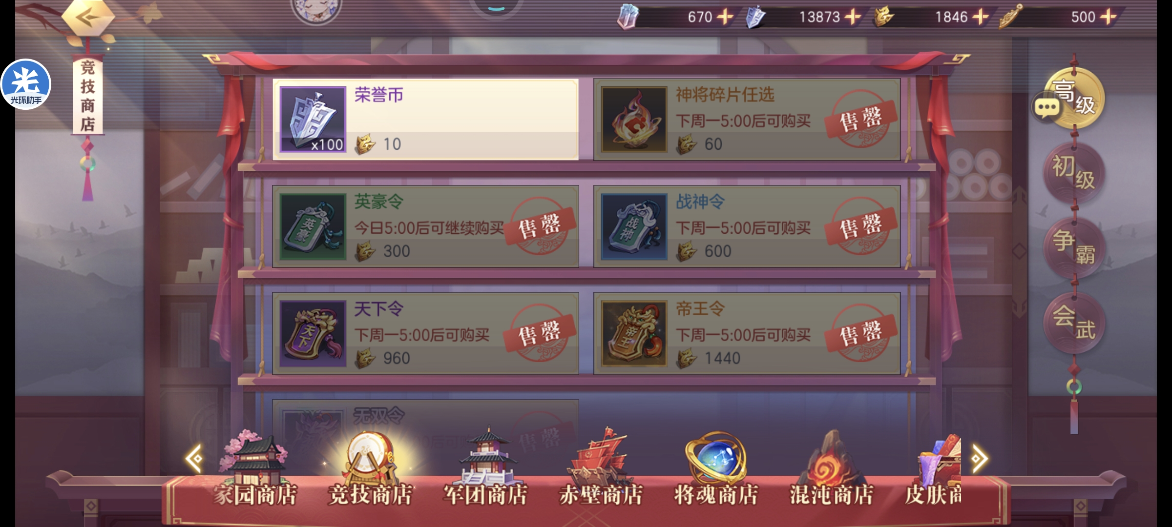 高级商店买掉所有的头衔令和神将碎片ps:绿色的英豪令是每日刷新记得买上,出售头衔令也是一笔不小的元宝来源(可以在背包里出售成元宝)